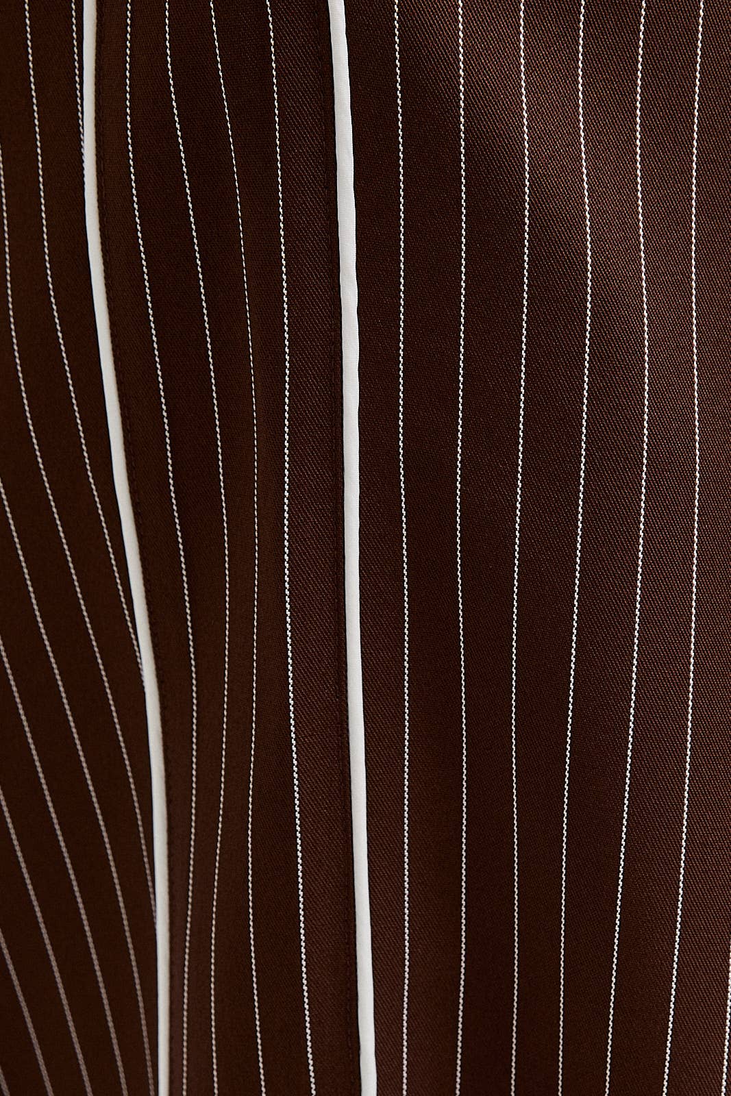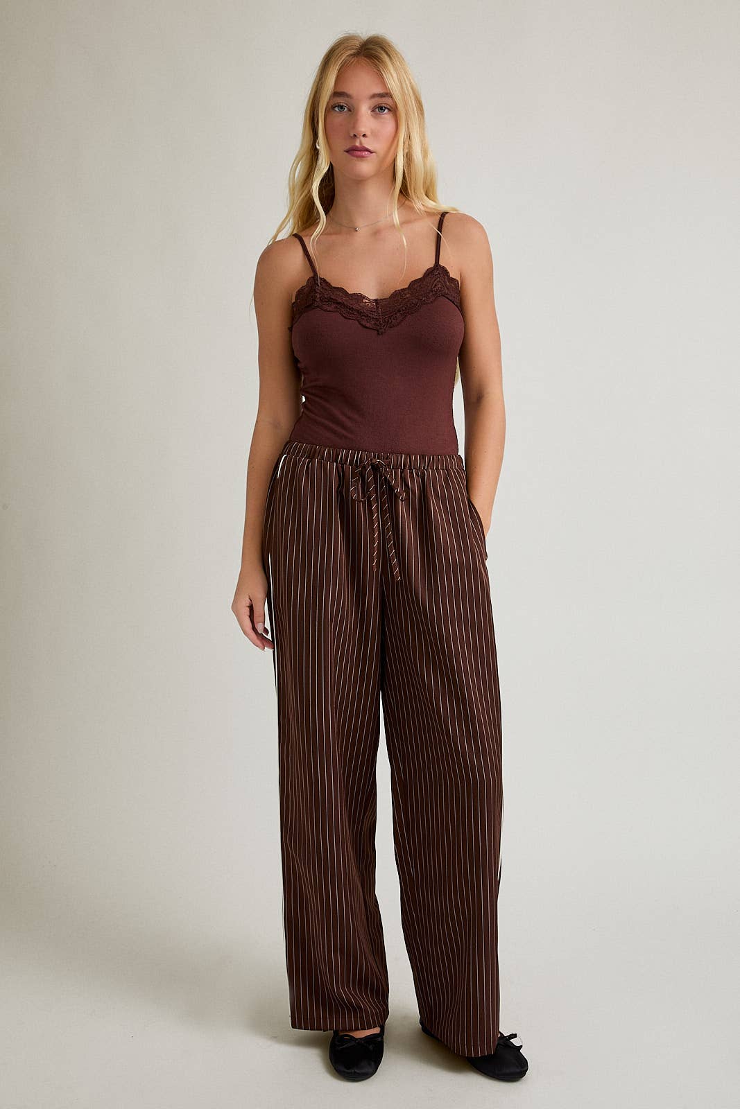 Laid-back ease meets tailored sophistication in The Rowan Pinstripe Pant. Designed in a rich espresso hue with fine white pinstripes, this wide-leg silhouette brings a modern edge to everyday dressing.