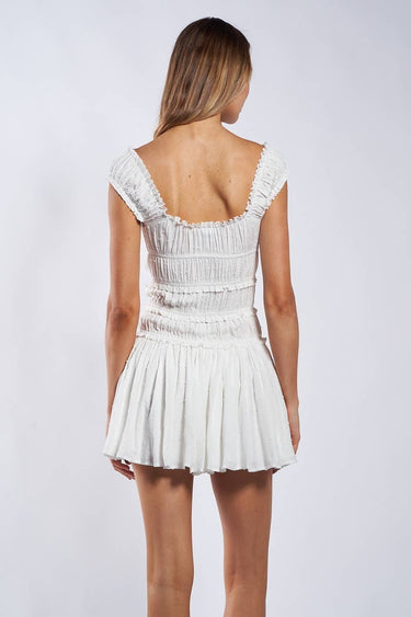 Embrace effortless elegance with our Ethereal Ruffle Smocked Mini Dress. Crafted in a soft, breathable fabric with delicate dot texture, this dress features a flattering smocked bodice with a charming drawstring tie at the neckline. The romantic ruffled cap sleeves and flowy skirt create a dreamy, feminine silhouette. Perfect for garden parties, brunch, or a casual day out, pair this dress with dainty jewelry and strappy sandals for a chic, carefree look.