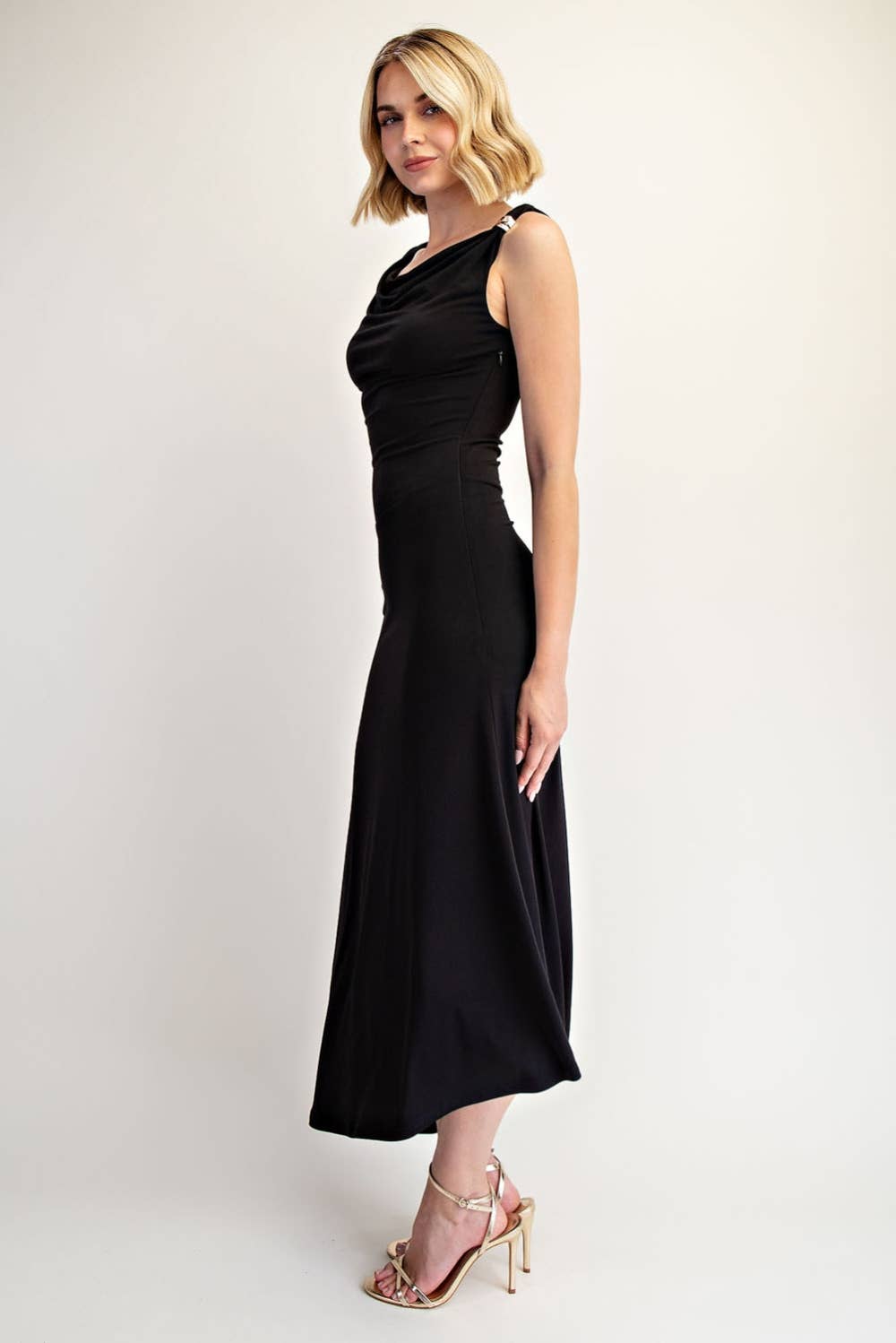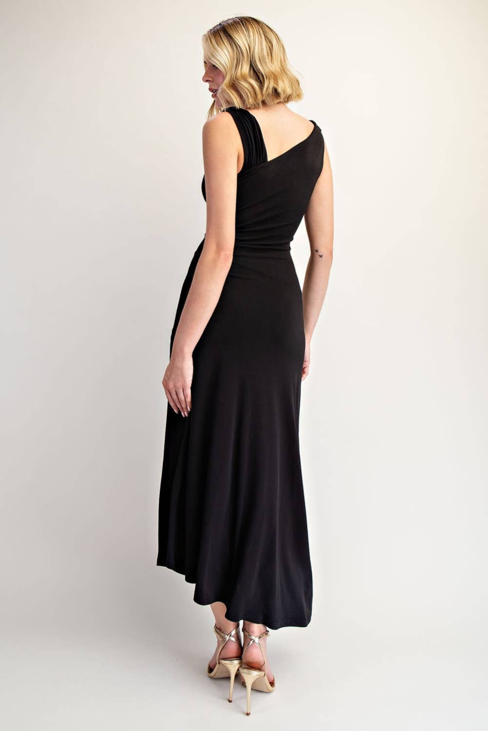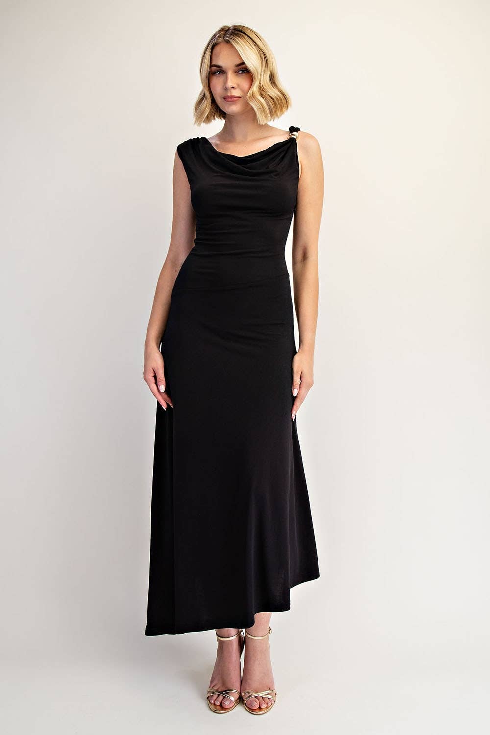 Step into timeless elegance with this black one-shoulder draped midi dress—a modern twist on the classic little black dress. Designed with a flattering draped neckline, a figure-skimming silhouette, and a chic knotted shoulder detail, it’s the ultimate piece for effortless sophistication. The flowing midi length strikes the perfect balance between classy and versatile, making it ideal for cocktail parties, date nights, weddings, and every event in between.