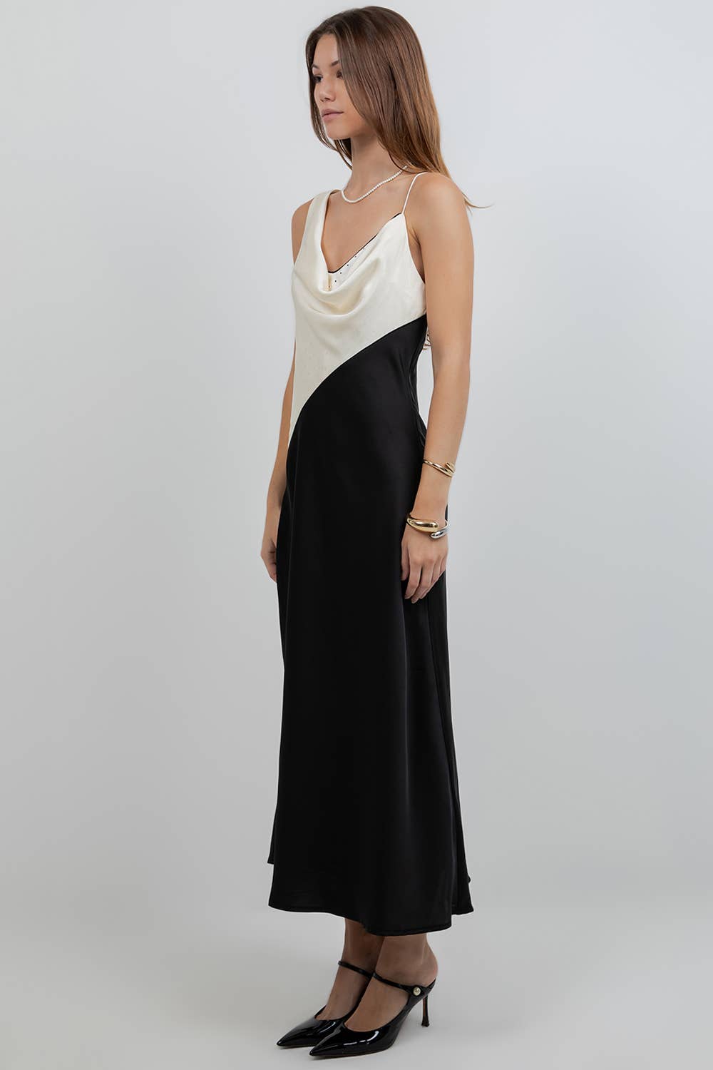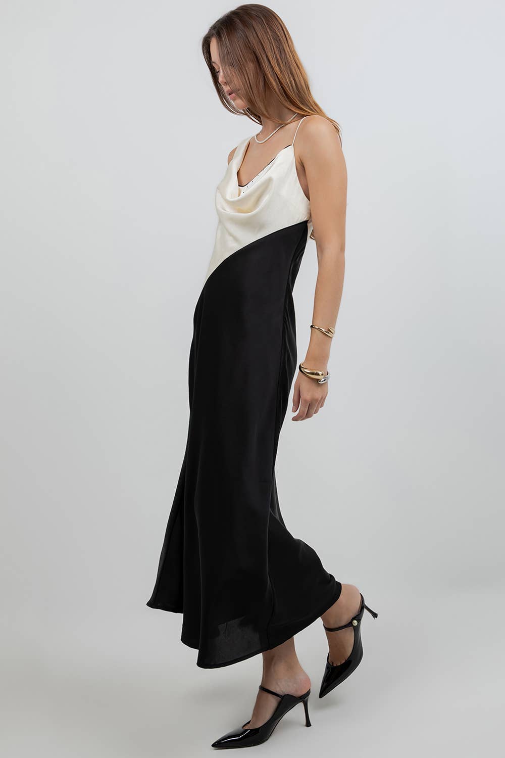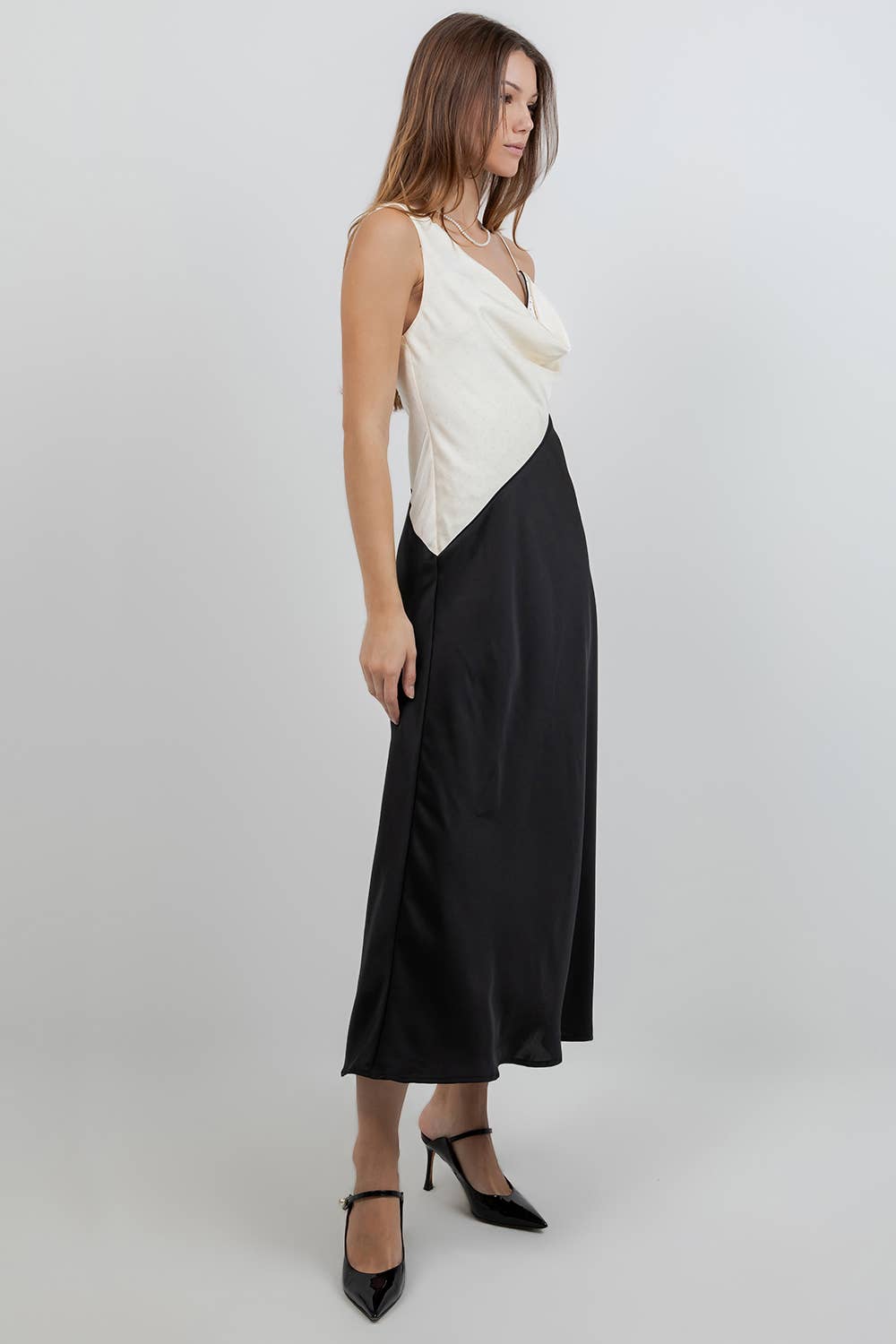 This two-tone slip dress is designed to make a quiet statement. Featuring a fluid draped neckline and clean color-block design, it skims the body with effortless ease while maintaining a refined silhouette.