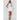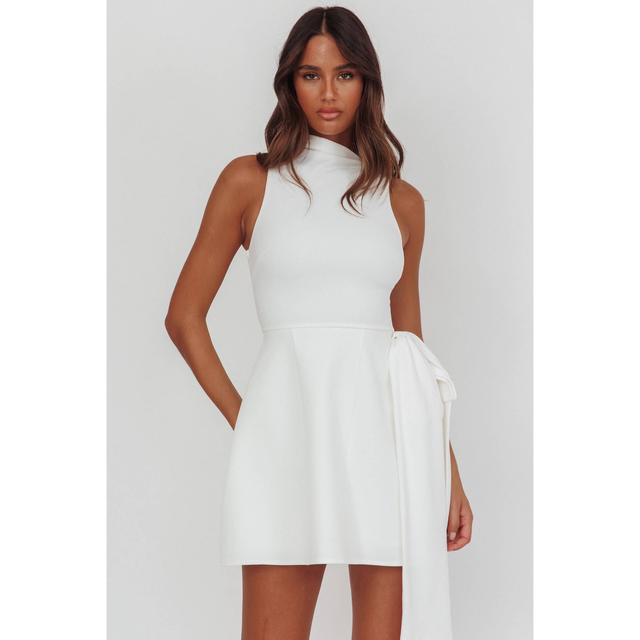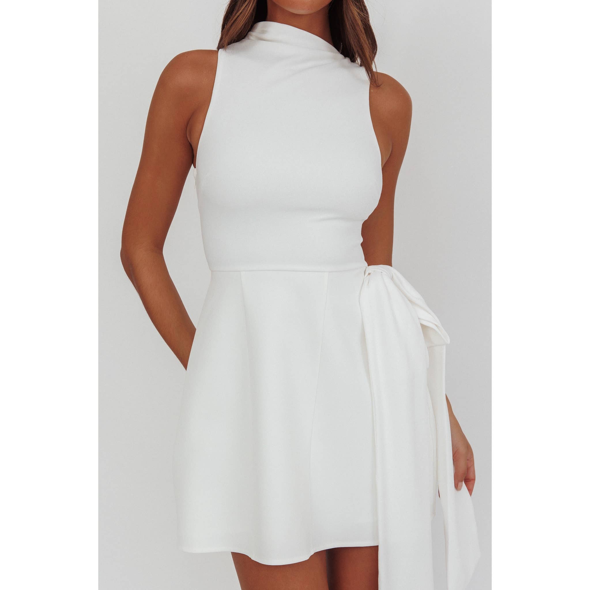 The dress is a sleeveless, white mini dress with a high neckline and a fitted bodice. It features a flared skirt and a long, asymmetrical sash detail that drapes from the side, adding a dramatic touch.