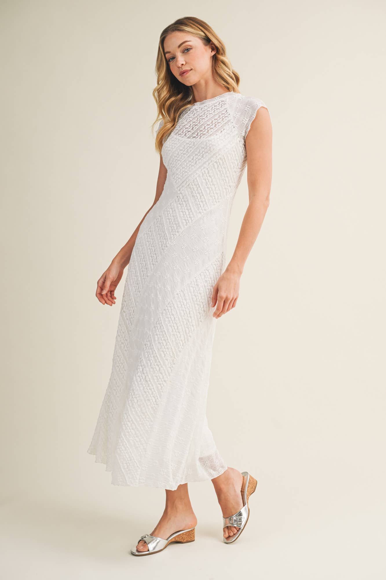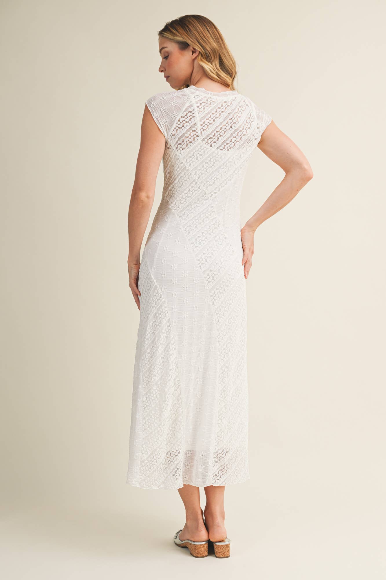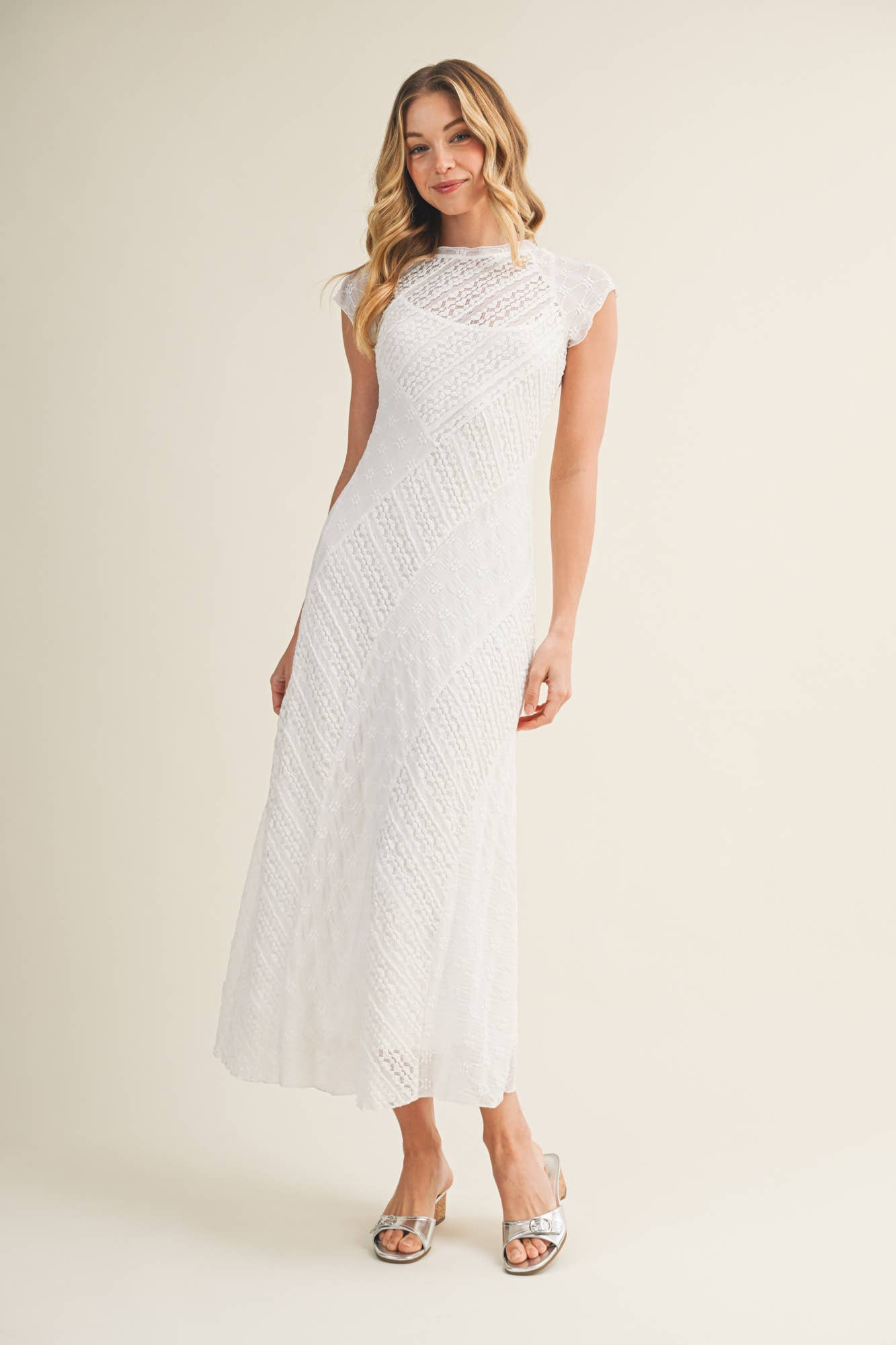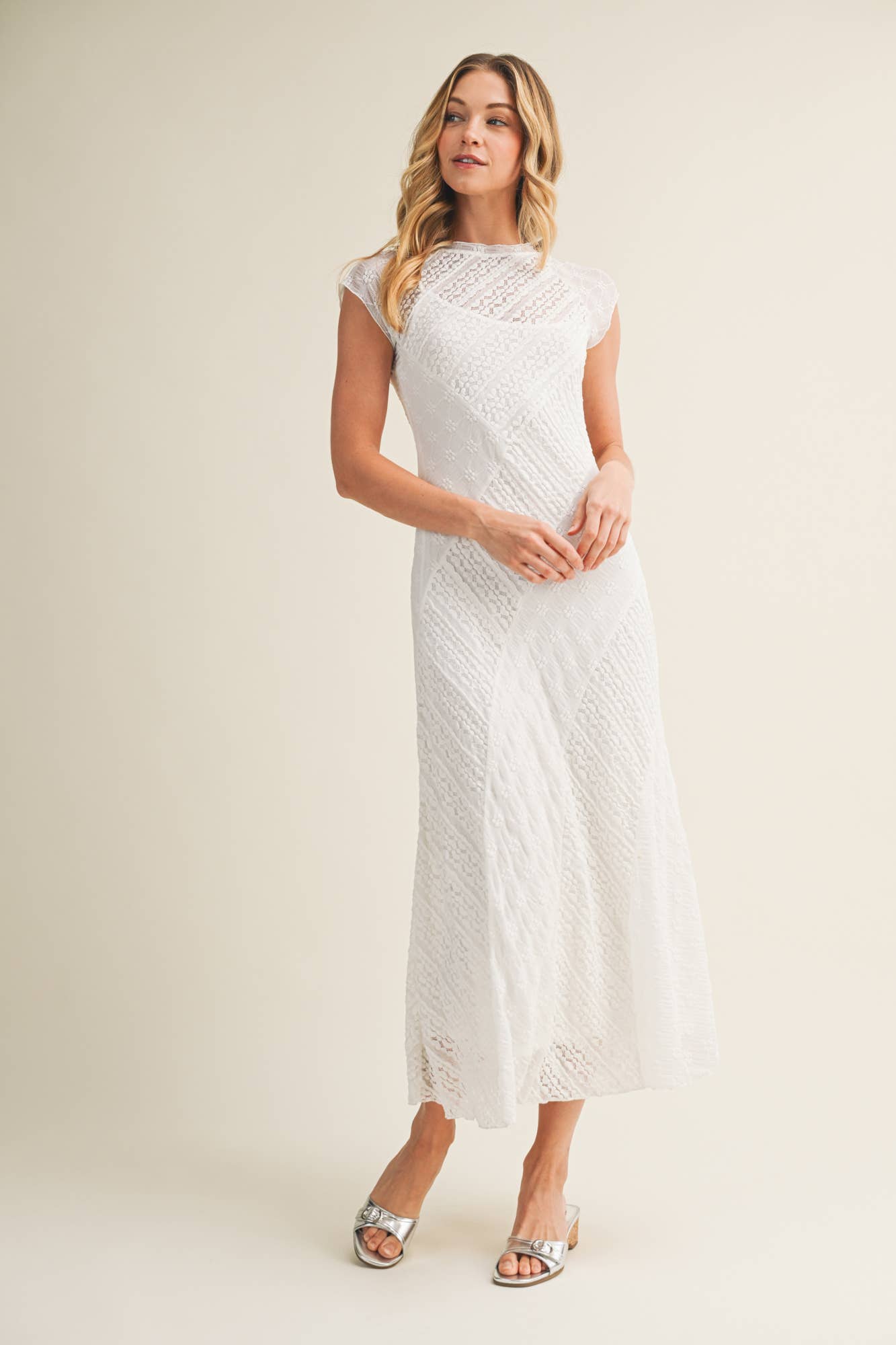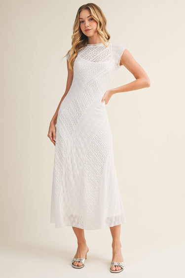 This white lace midi dress is designed to flatter with delicate texture and a softly sculpted fit. Crafted from intricate patterned lace, it features cap sleeves, a high neckline, and subtle sheer detailing that adds dimension while remaining refined.