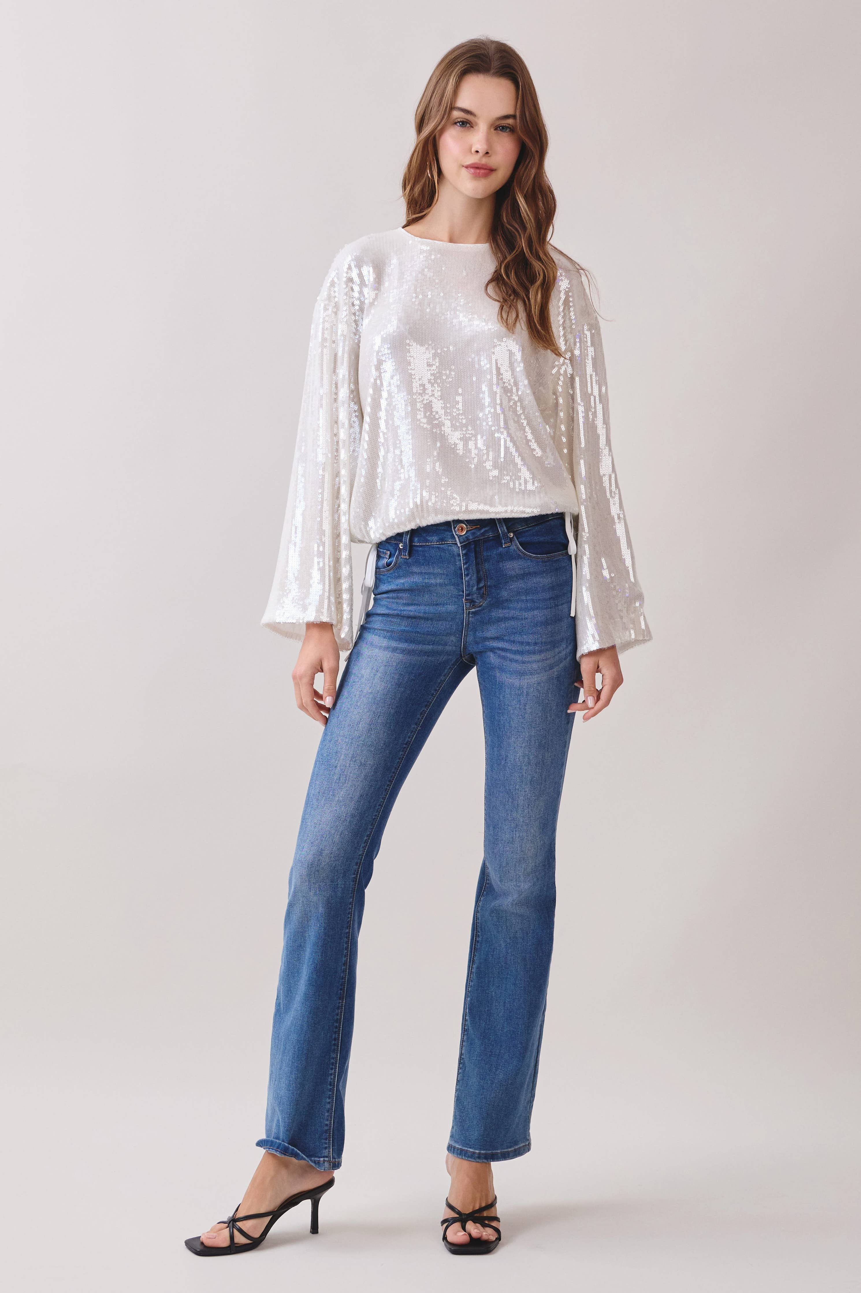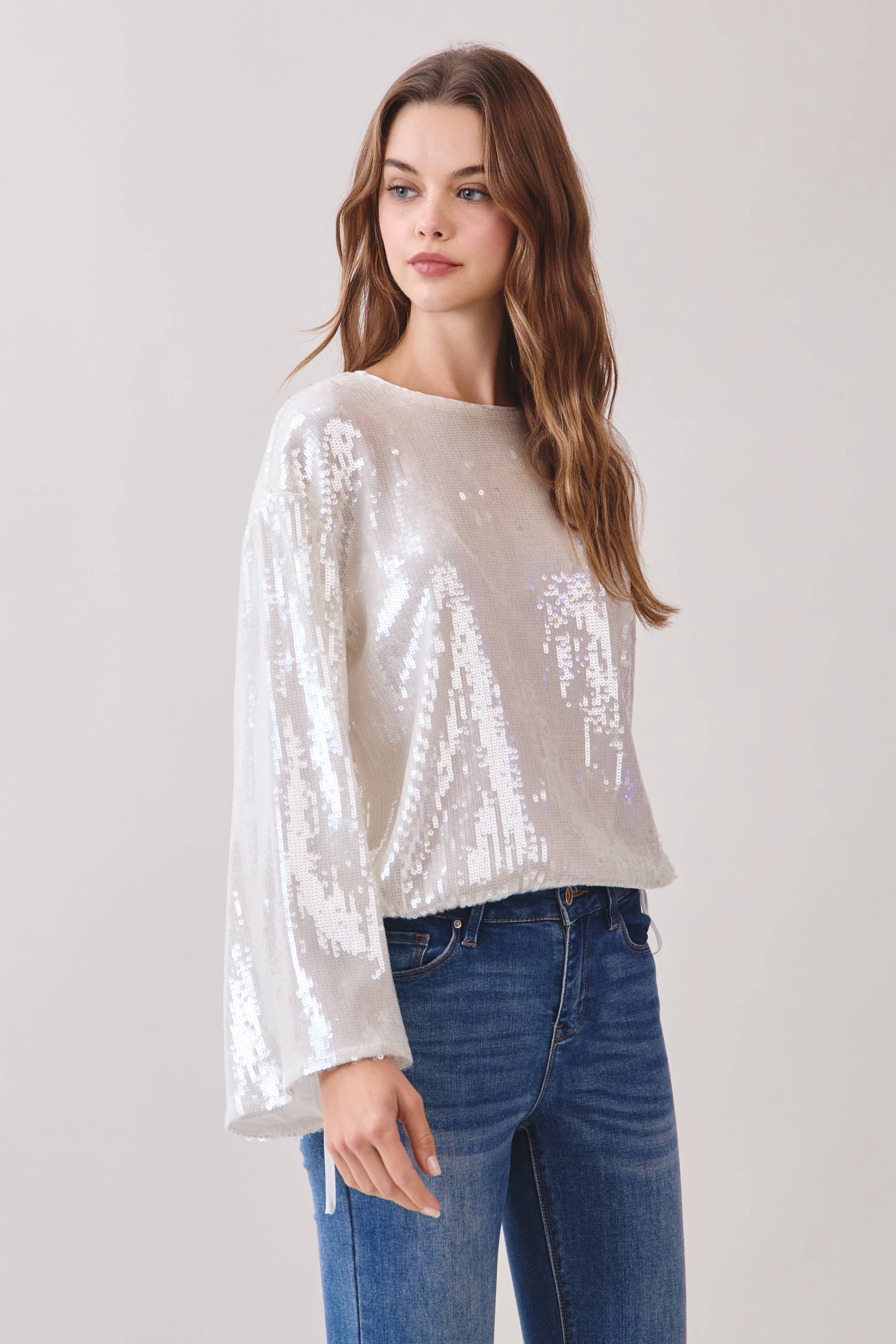 Soft shimmer meets effortless elegance in this Sequin Long-Sleeve Blouse. Designed with a relaxed silhouette, this top features delicate allover sequins that catch the light beautifully without feeling overdone. The sheer long sleeves add an airy touch, while adjustable side ties allow for a subtle, flattering shape.