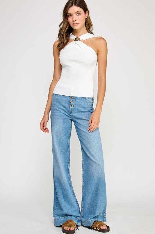 Elevate your everyday style with this chic white halter top. Designed with a sleek ribbed knit fabric, it features a flattering halter neckline accented by a gold ring detail that adds just the right amount of sophistication. The fitted silhouette makes it versatile enough to pair with jeans for a casual day out or with a skirt and heels for an elevated evening look. Comfortable, modern, and effortlessly stylish—this is your go-to top for every occasion.Made with 63% viscose 37% nylon.