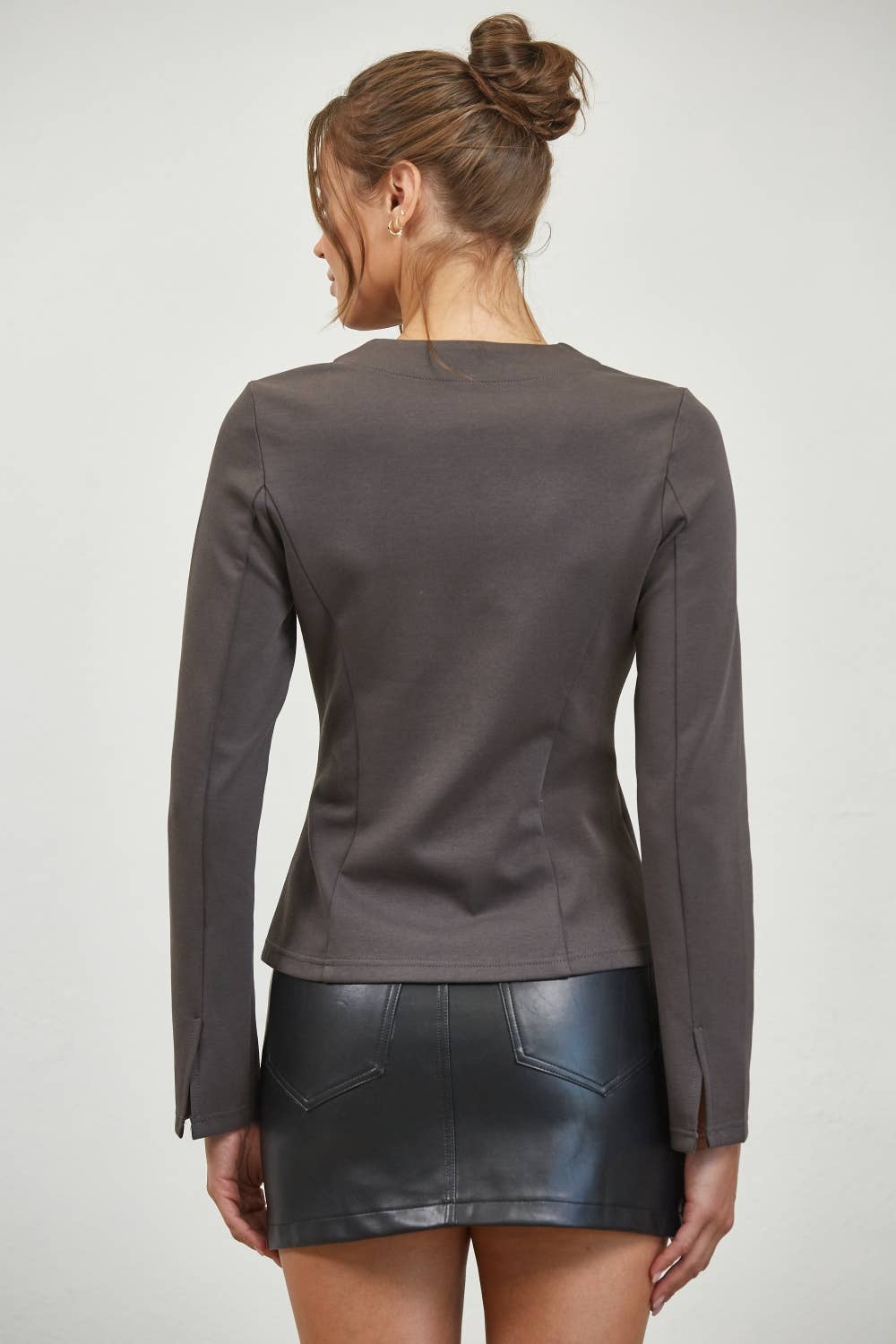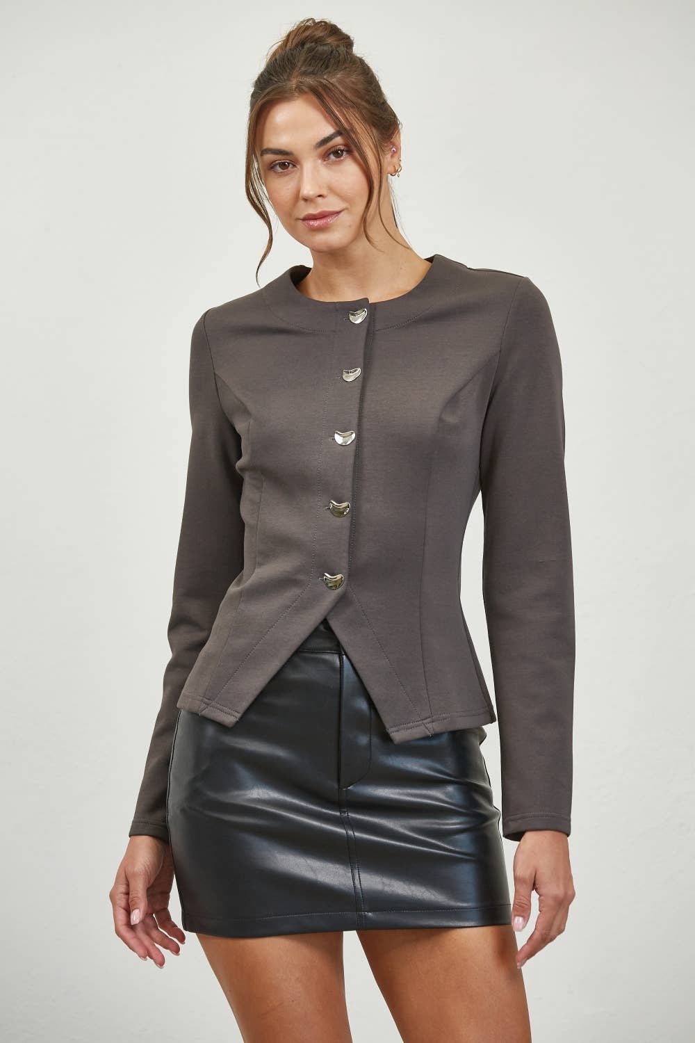 Command attention in The Monarch Jacket, where tailored elegance meets modern edge. Designed with a sculpted silhouette and butterfly-inspired metallic buttons, this structured piece brings sophistication to every look. The soft-yet-substantial fabric contours beautifully to the body, while the asymmetric hemline adds a touch of architectural flair.