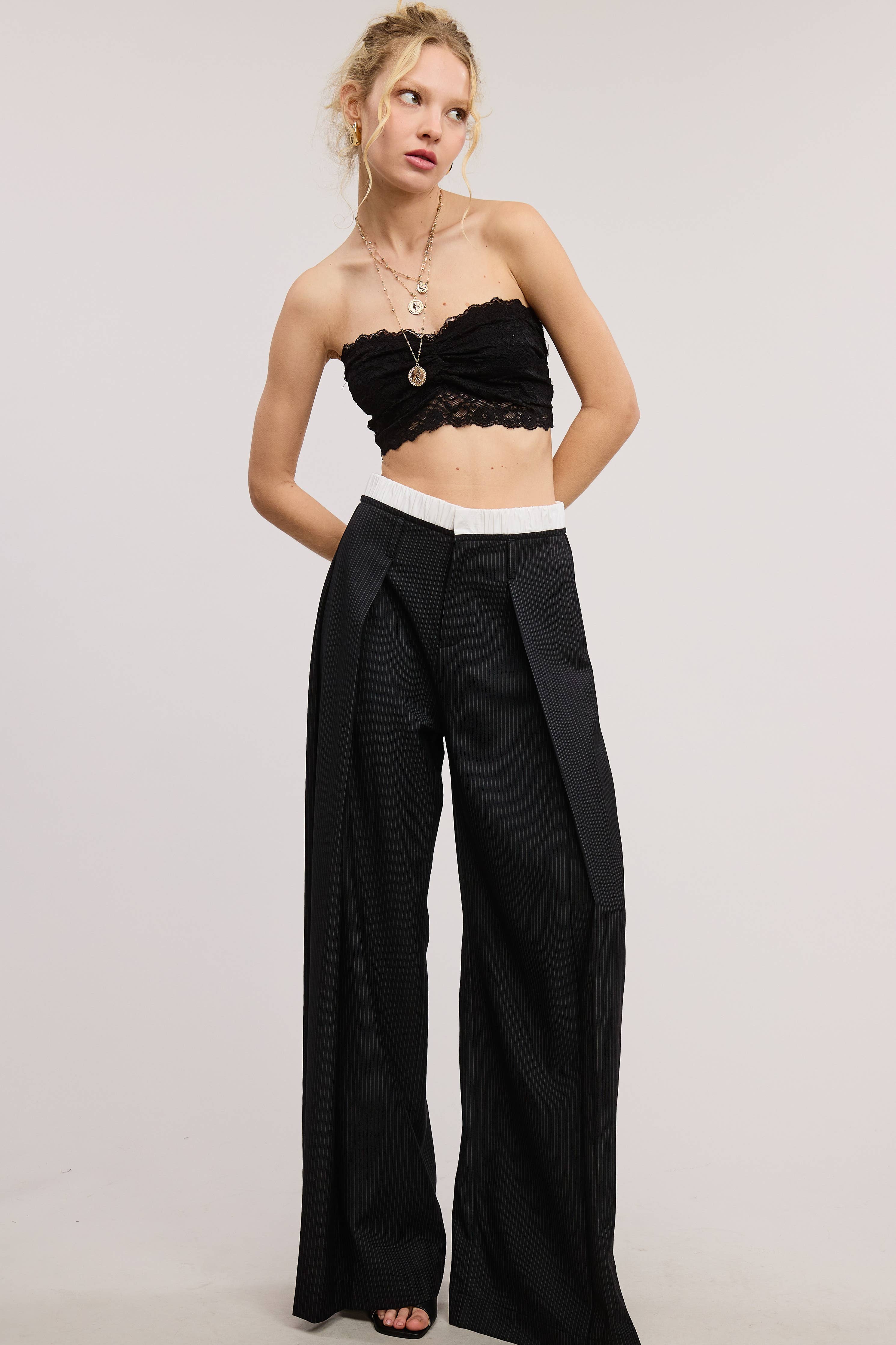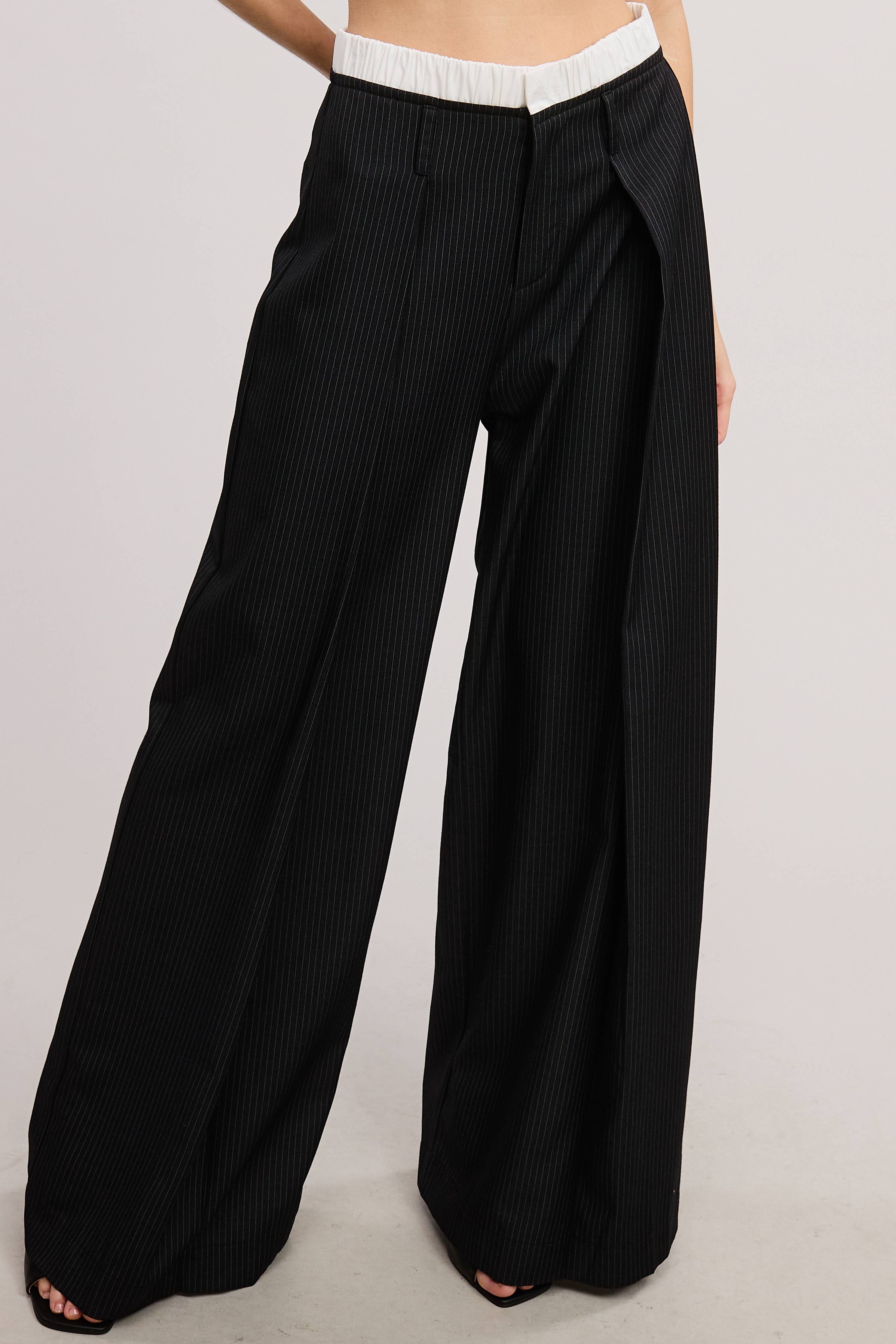 Structured meets effortless in The Mercer Pinstripe Trouser. Designed with a modern wide-leg silhouette and a subtle pinstripe pattern, these tailored pants redefine classic suiting with a contemporary twist. The contrast white waistband adds a clean, unexpected edge — a detail that nods to elevated street style while keeping it polished.