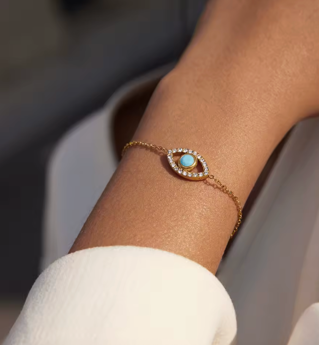 Elegant and meaningful, the Evil Eye Bracelet is designed to bring a touch of protection to everyday styling. Featuring a turquoise-tone center framed by shimmering white zirconia stones, the eye motif is set on a delicate gold-tone stainless steel chain for a refined, minimal finish.