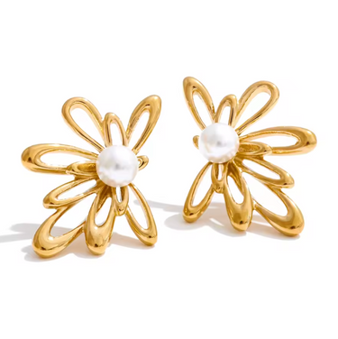 Gold Petal Pearl Stud Earrings