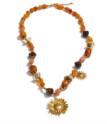 Shine bright with this radiant necklace, crafted from warm-toned gemstone-inspired beads in rich amber, caramel, and chocolate hues. At its center, a bold hammered gold sun medallion makes a striking statement, complemented by a smaller sun charm for extra detail. The combination of earthy beads and golden accents creates a piece that feels both grounded and celestial — perfect for adding warmth and personality to any look.