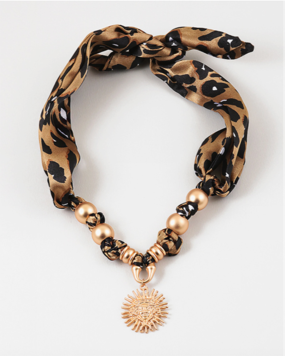Daring yet refined, the Leopard Scarf Necklace with Sun Medallion Pendant captures the essence of radiant confidence. A silky leopard-print scarf is intertwined with gleaming gold beads and finished with a sculptural sunburst medallion — a symbol of strength and vitality. Bold enough to stand alone, yet elegant enough to elevate any look.