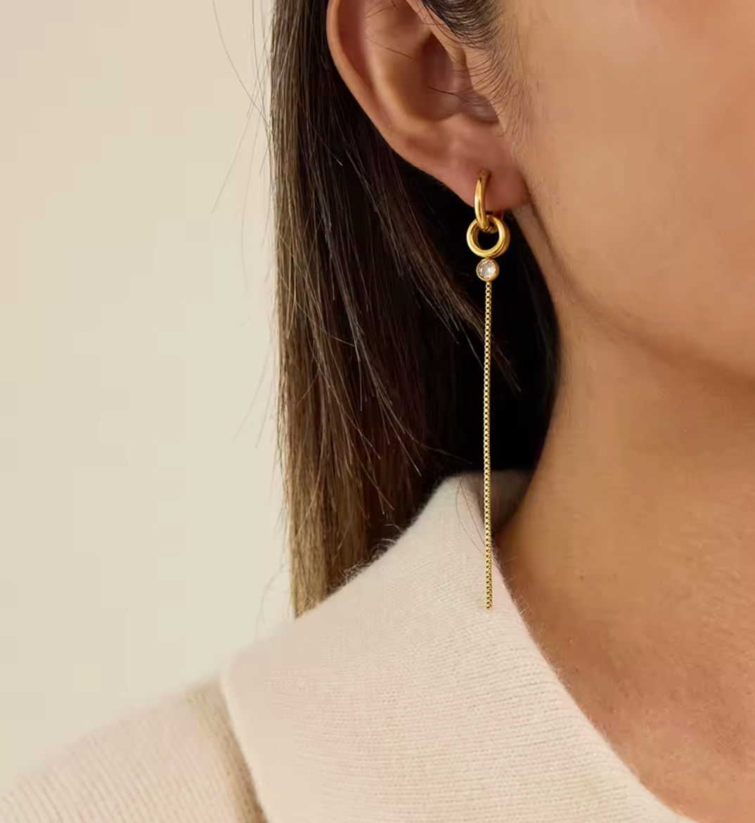 Sleek, minimal, and endlessly elegant. These drop chain earrings feature a petite gold huggie accented with a bezel-set crystal and a long, slender chain that adds fluid movement with every step. The clean lines and delicate sparkle make them perfect for both everyday styling and elevated evenings out.