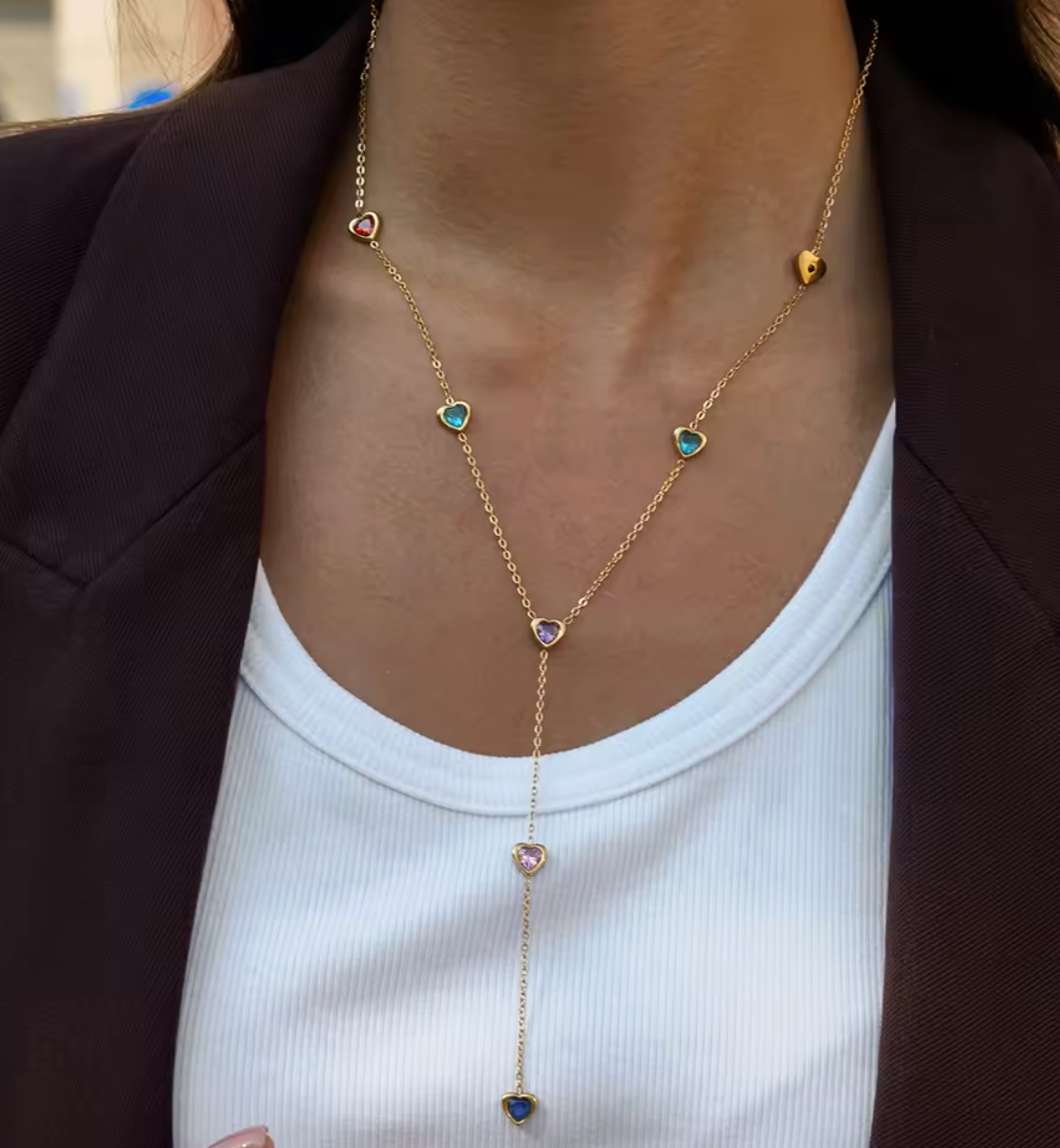 Delicate and expressive, the Amore Multi-Heart Lariat Necklace is designed to move gracefully with you. Featuring petite heart-shaped charms in soft, luminous hues, this fine gold-tone chain drapes effortlessly along the neckline and décolletage. The lariat silhouette adds a subtle statement, creating length and elegance without feeling overstated.