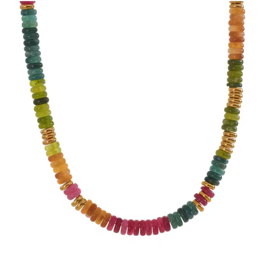 Brighten up your jewelry rotation with our Rainbow Disc Bead Necklace. This playful piece features a vibrant mix of multicolor disc beads, separated by pops of polished gold-tone spacers for a touch of shine. Whether worn solo or layered, it brings joyful energy and bold style to any outfit. Crafted with stainless steel hardware for a waterproof, hypoallergenic finish.
