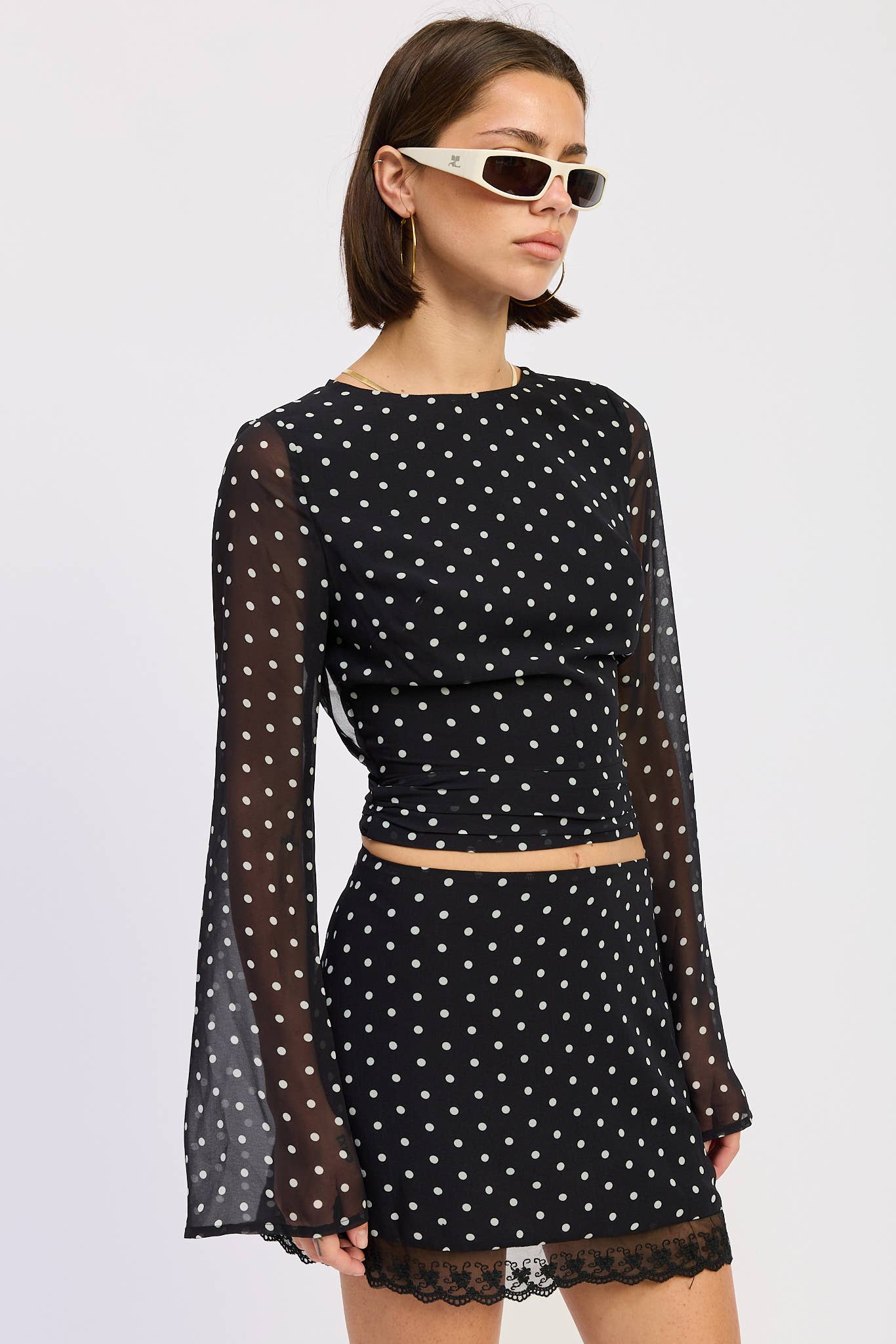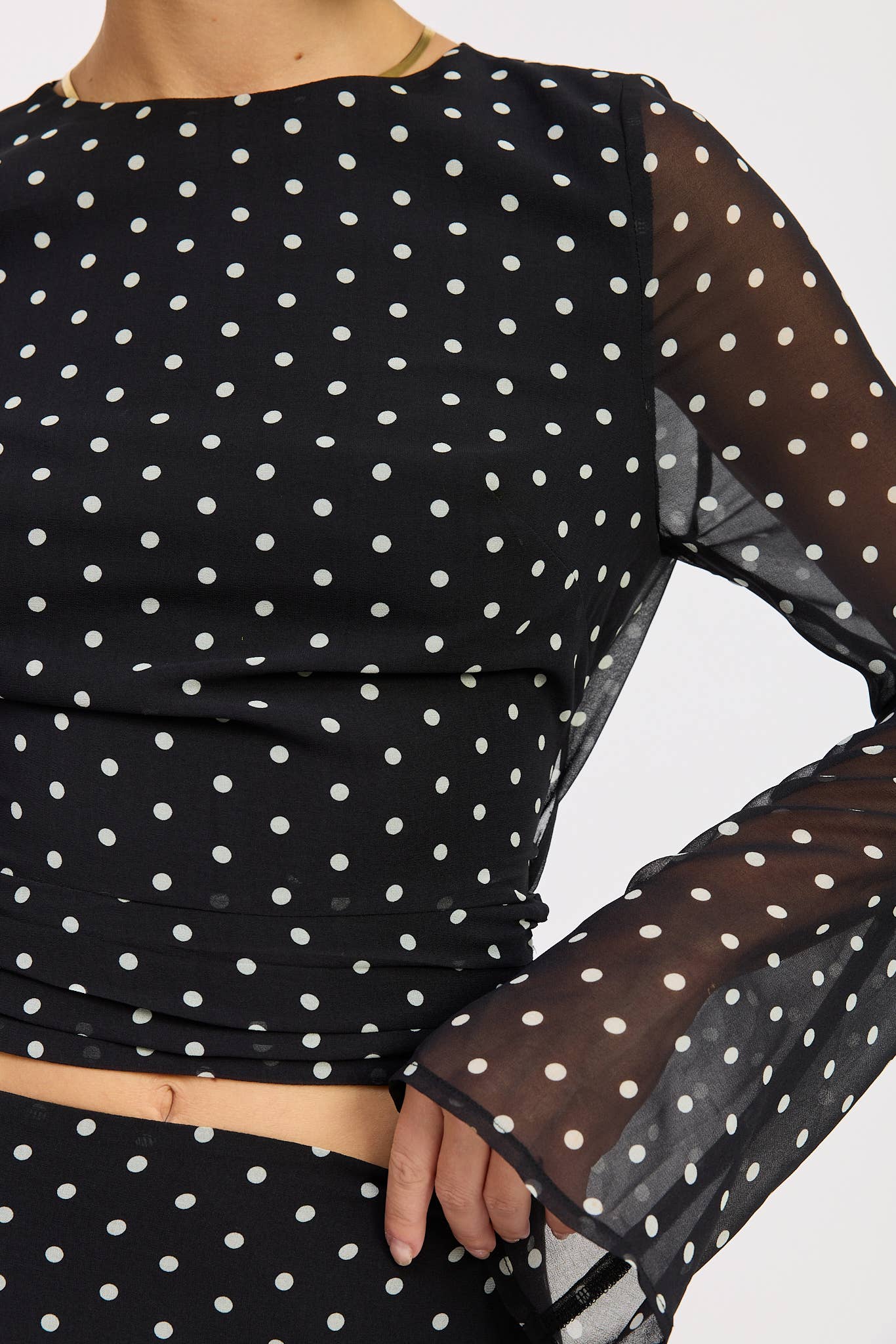 The perfect blend of modern elegance and playful charm, this black polka-dot long-sleeve top is your new day-to-night essential. Designed with sheer, flowy bell sleeves and a high neckline, it creates a polished silhouette from the front — while the unexpected open-back detail adds a bold, feminine twist.