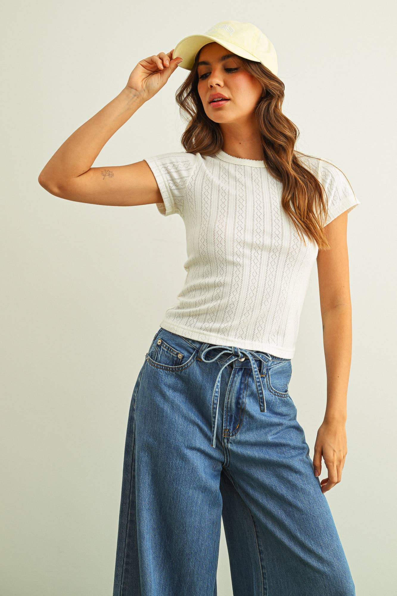 A refined take on the everyday tee. This short-sleeve knit top is crafted in a delicate pointelle pattern that adds subtle texture and femininity while maintaining a clean, minimalist silhouette. Designed with a soft, close-to-the-body fit, it’s lightweight, breathable, and effortless to style.