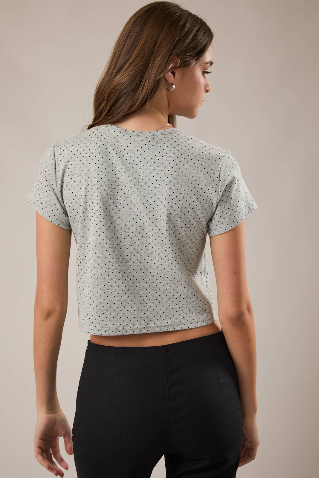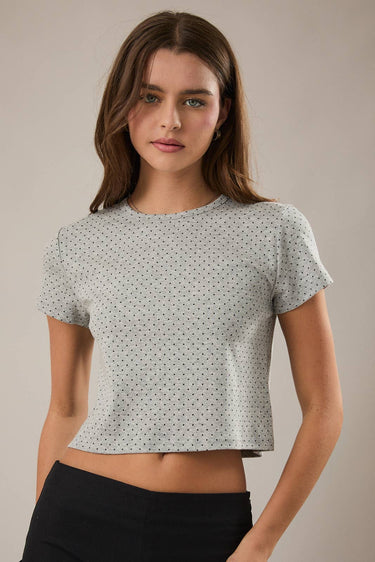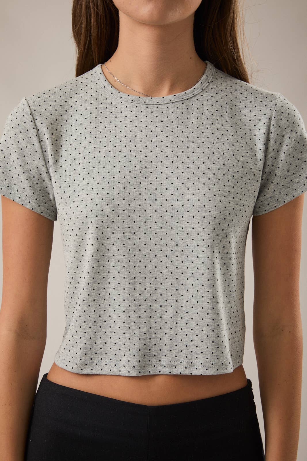 This Short Sleeve Baby Tee in Heather Grey with Black Dot Print is your new everyday essential with a playful twist. Designed with a fitted, cropped-inspired silhouette, this tee hugs just right while keeping things comfortable and lightweight. The subtle black dot pattern adds a fun, elevated detail that sets it apart from a basic tee.