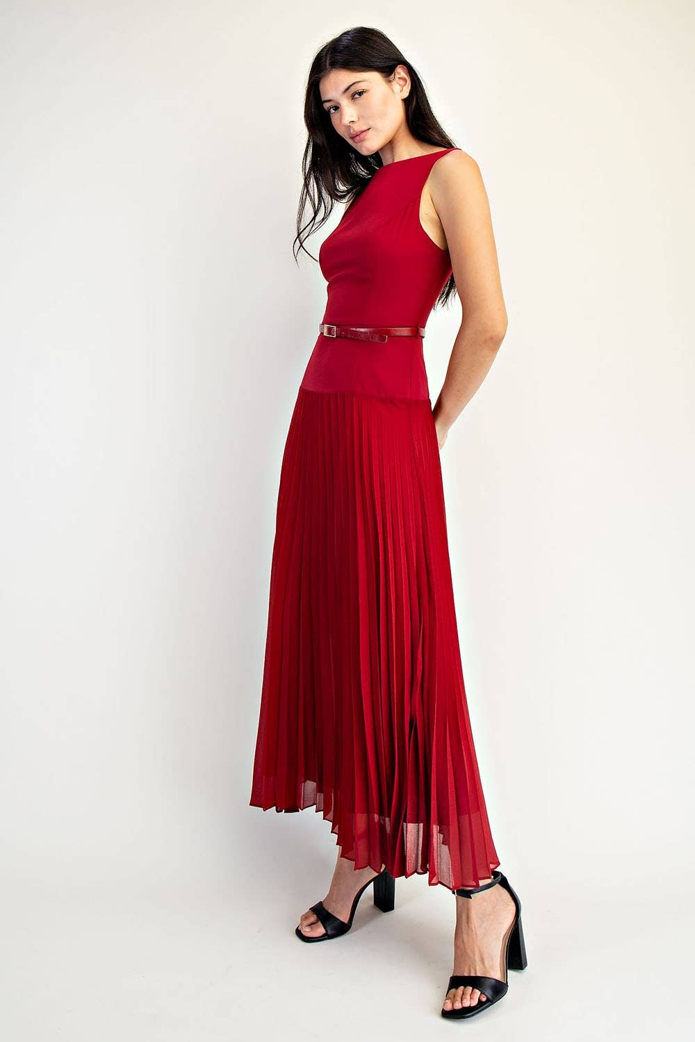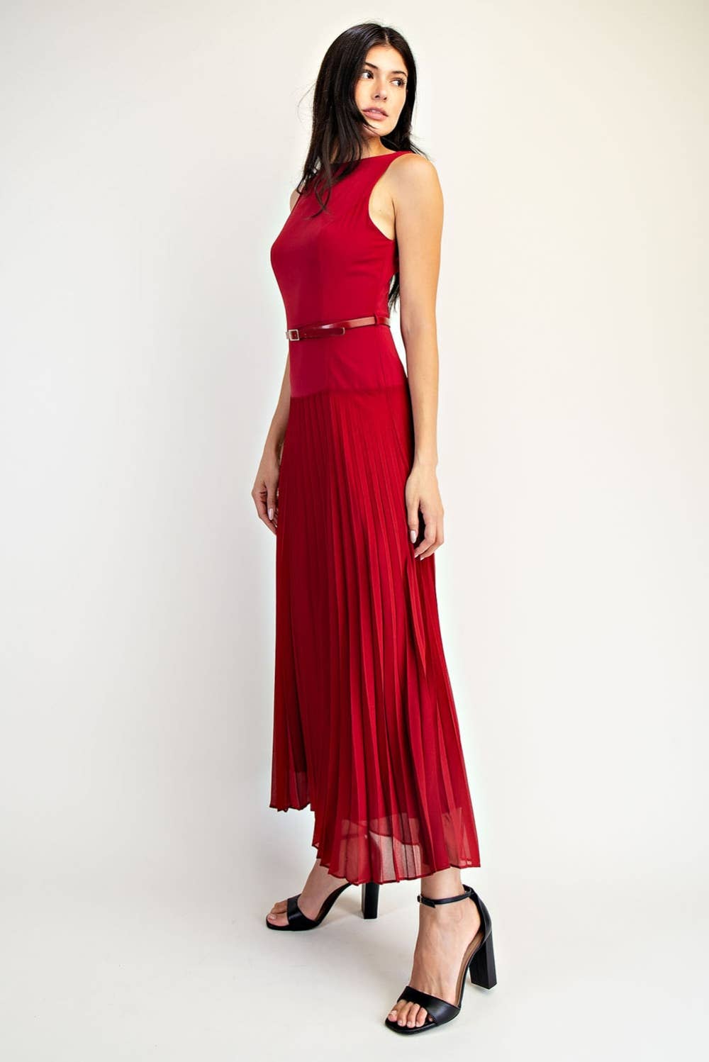 Graceful and refined, this sleeveless pleated maxi dress captures timeless elegance with modern appeal. Designed with a clean, fitted bodice that transitions into a flowy accordion-pleated skirt, the silhouette flatters and elongates effortlessly. A slim, adjustable belt at the waist accentuates the figure and adds a touch of polished structure. The soft chiffon movement and sleeveless cut make this piece perfect for daytime sophistication or evening charm. Whether worn to a wedding, holiday gathering, or formal dinner, this dress makes an elegant statement with ease.