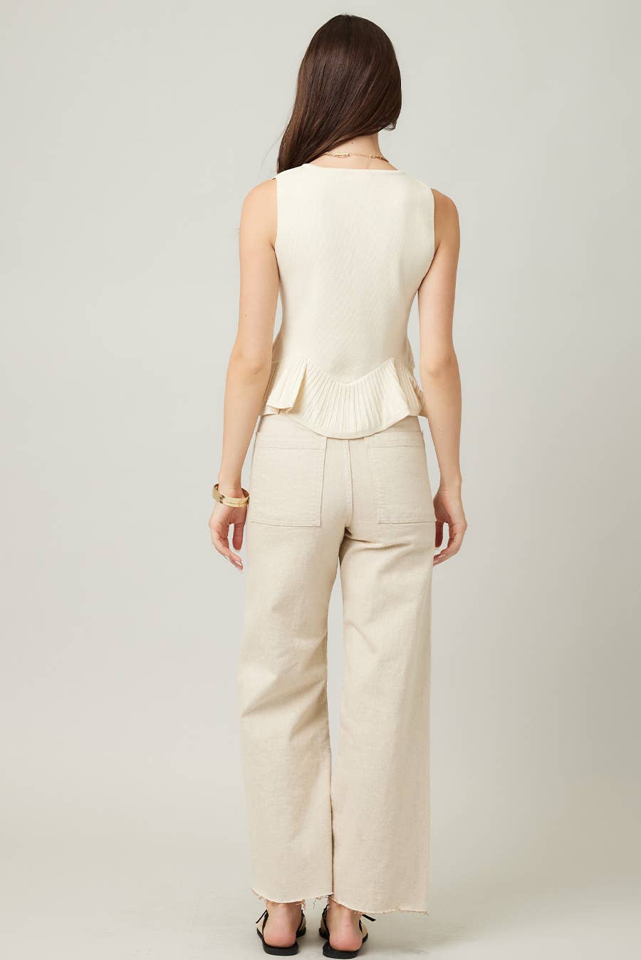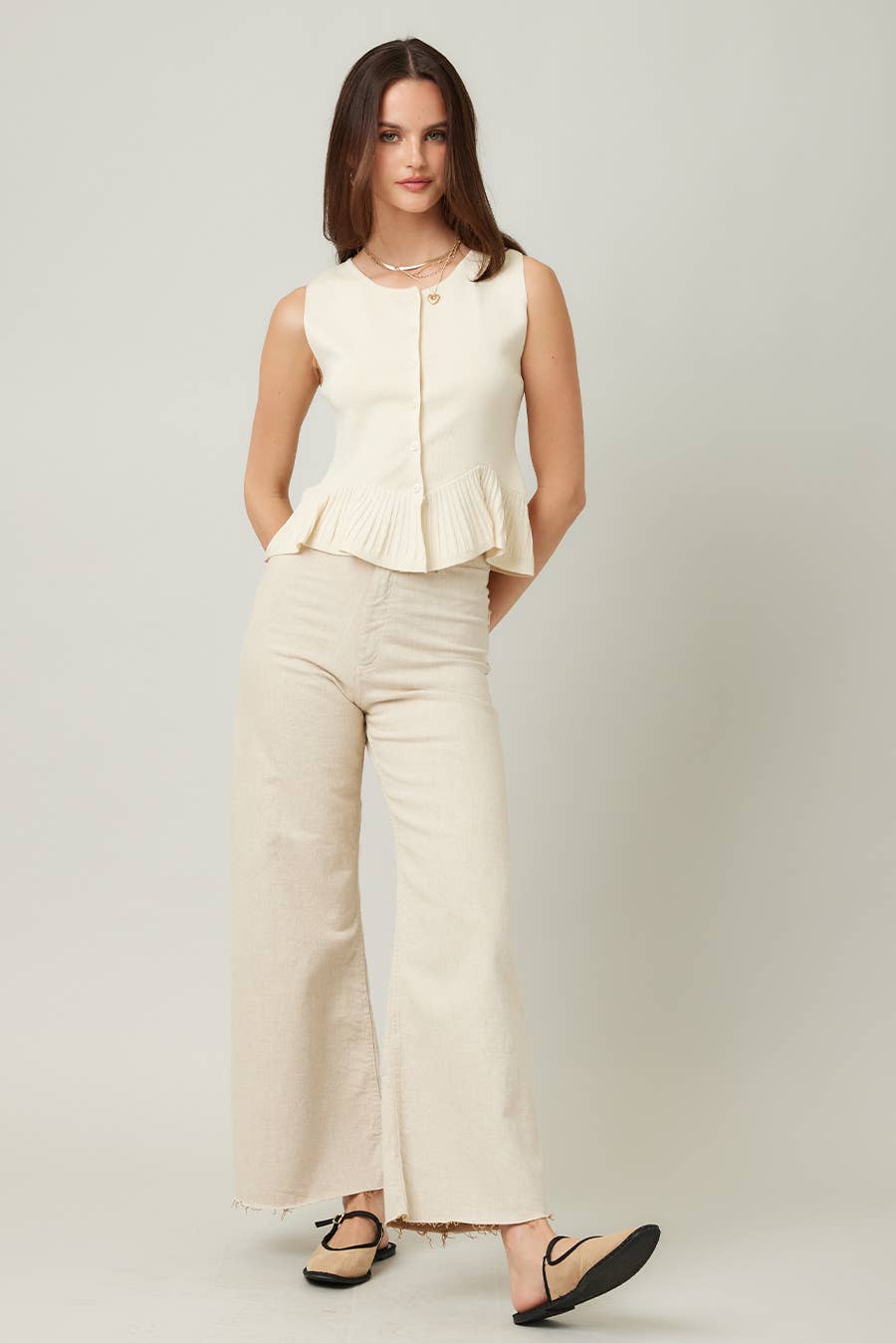 Feminine, refined, and softly structured — The Inara Peplum Knit Top is the perfect blend of modern polish and timeless charm. Crafted in a creamy neutral hue, this sleeveless knit features a button-down front and a delicate pleated peplum hem that flatters the waist with graceful movement.
