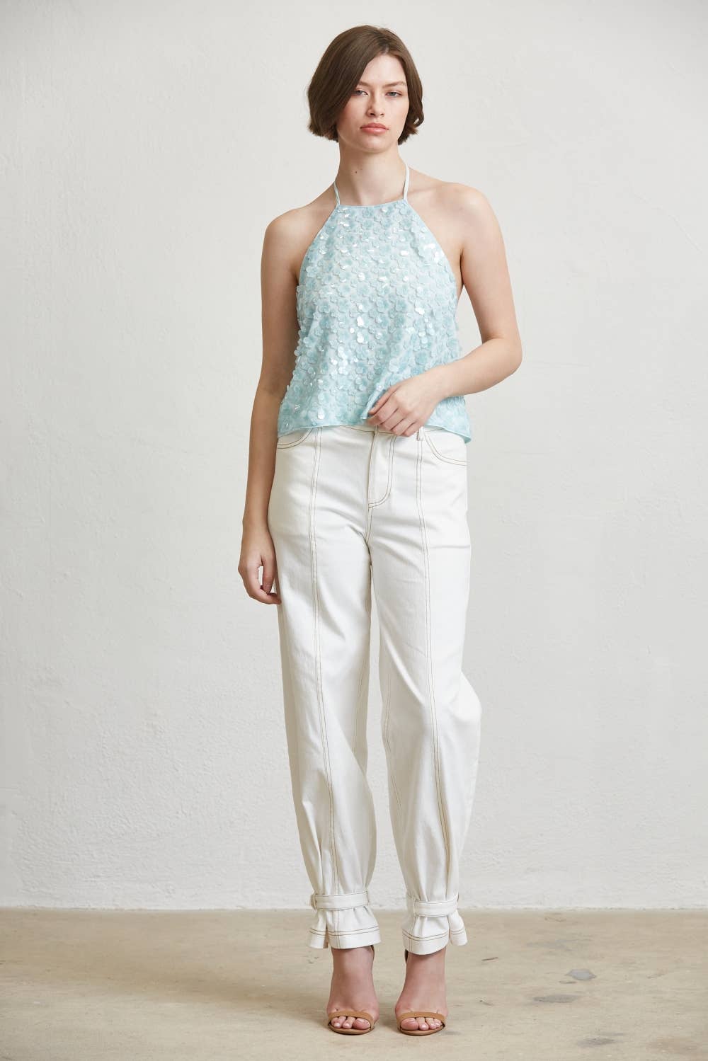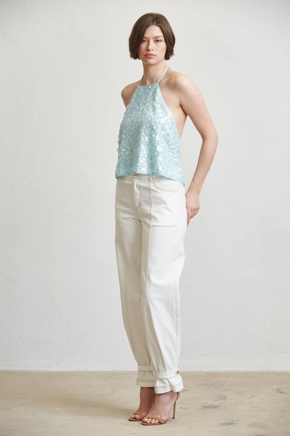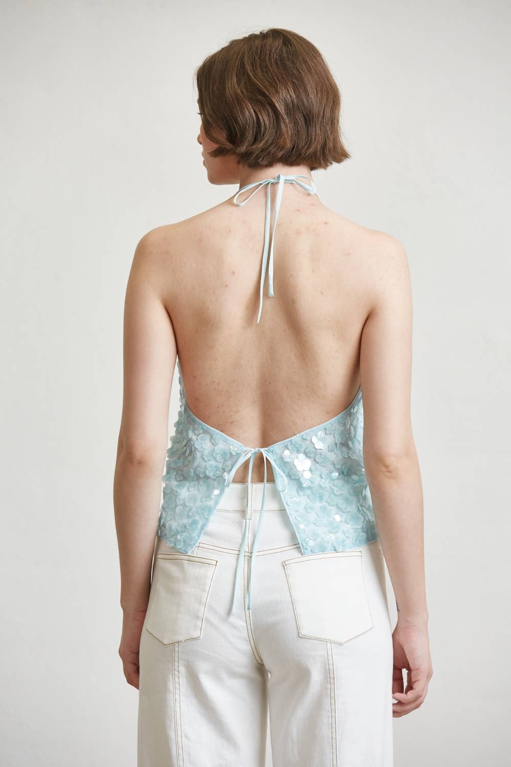 This halter top delivers a statement look with a refined silhouette designed for elevated day to night wear. Crafted with an allover textured surface, the front features a clean halter neckline that frames the shoulders while offering a balanced, structured drape through the body. The open back design is finished with adjustable self tie closures, allowing for a customized and secure fit. Lightweight construction keeps the piece comfortable while maintaining visual impact. The cropped length hits at the waist, making it ideal for pairing with high rise bottoms or tailored separates.
