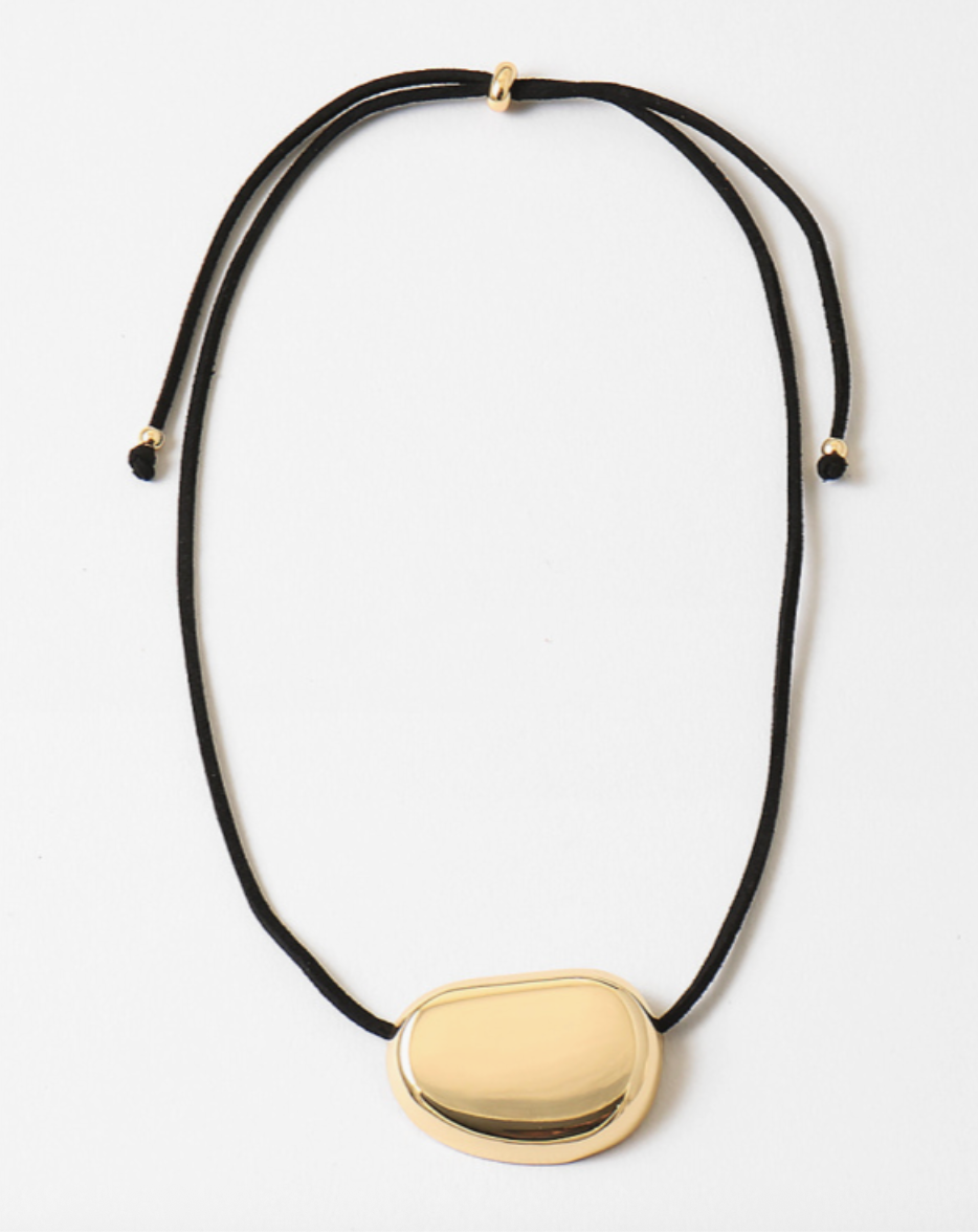 Simplicity with a sculptural edge. The Gold Cord Necklace features a smooth, organic gold-tone pendant suspended from a soft black cord — a perfect balance of bold form and refined minimalism. Designed to add quiet confidence to any outfit, it’s an effortless piece that transitions seamlessly from day to night.