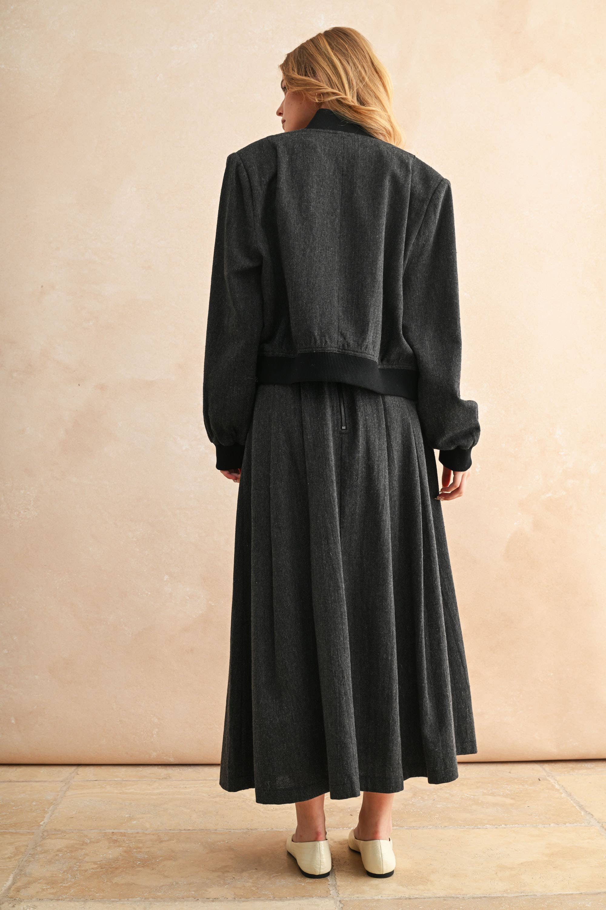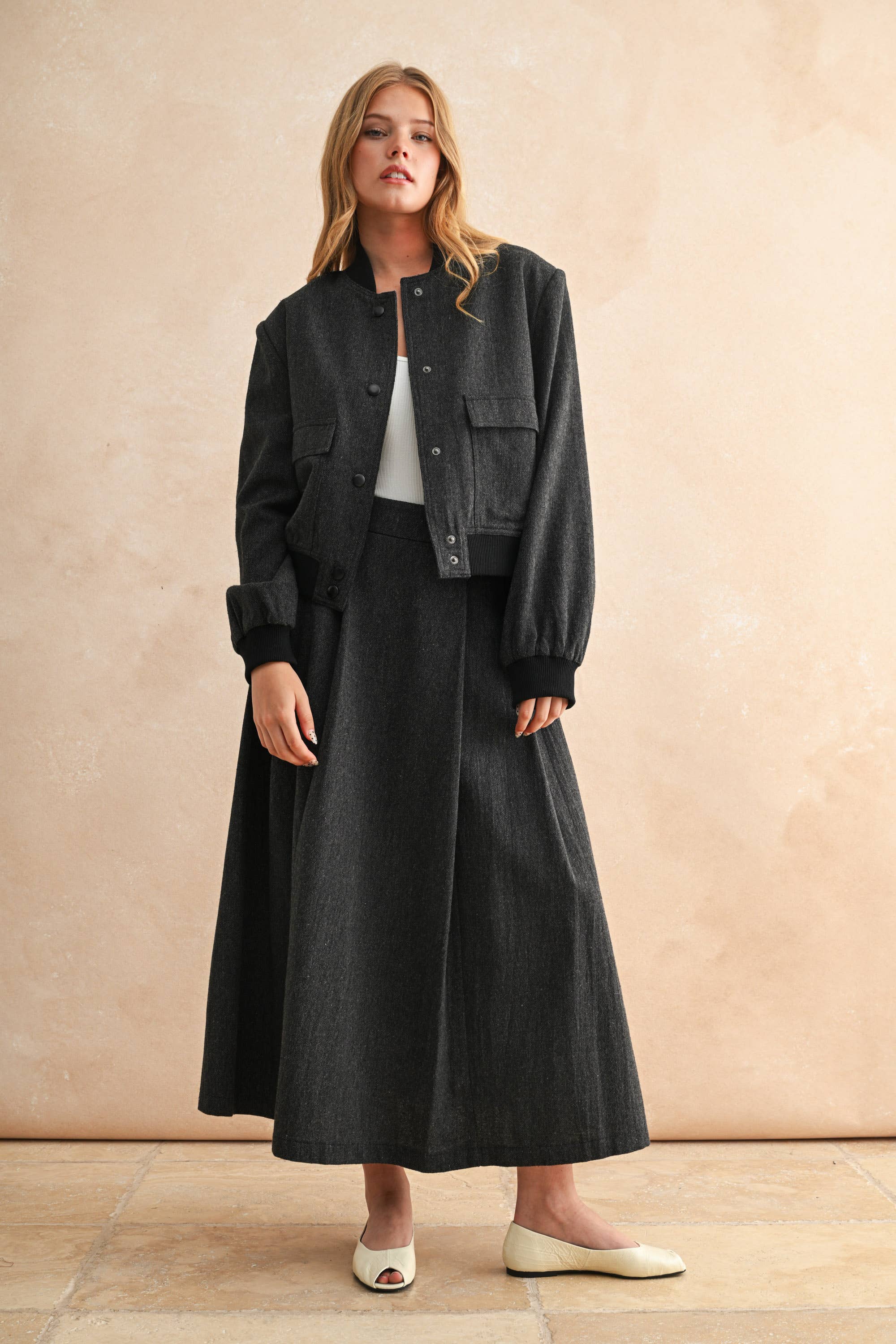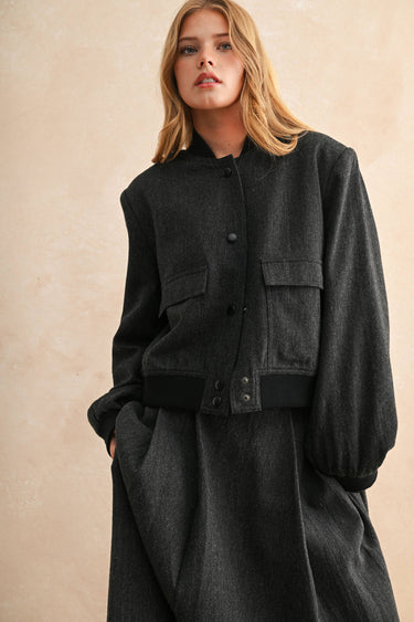 Effortlessly cool with a tailored edge, this Structured Bomber Jacket is the perfect blend of modern polish and everyday wearability. Designed in a rich charcoal hue, it features a clean snap-button front, subtle pocket detailing, and softly ribbed cuffs for a relaxed yet refined silhouette.