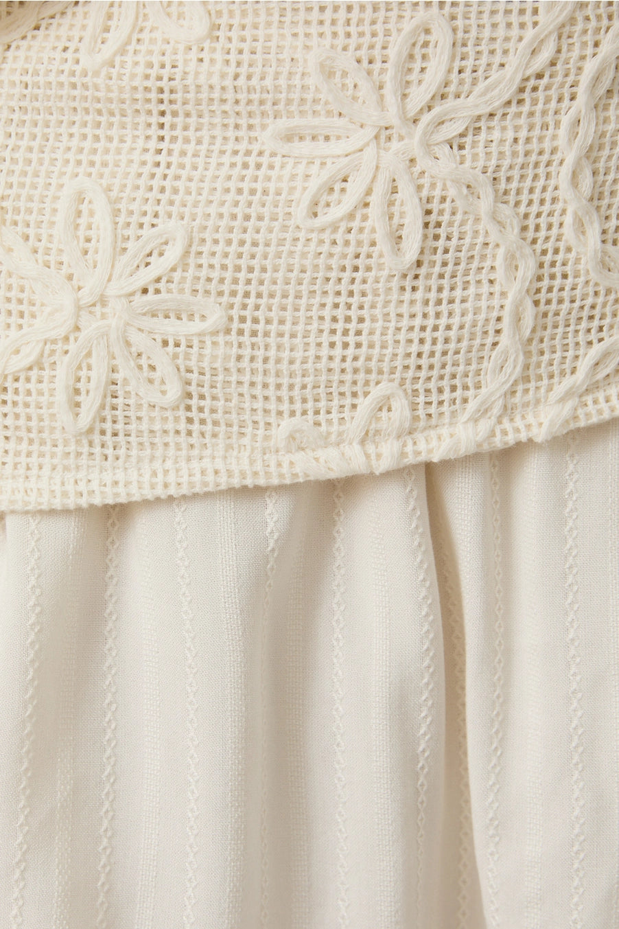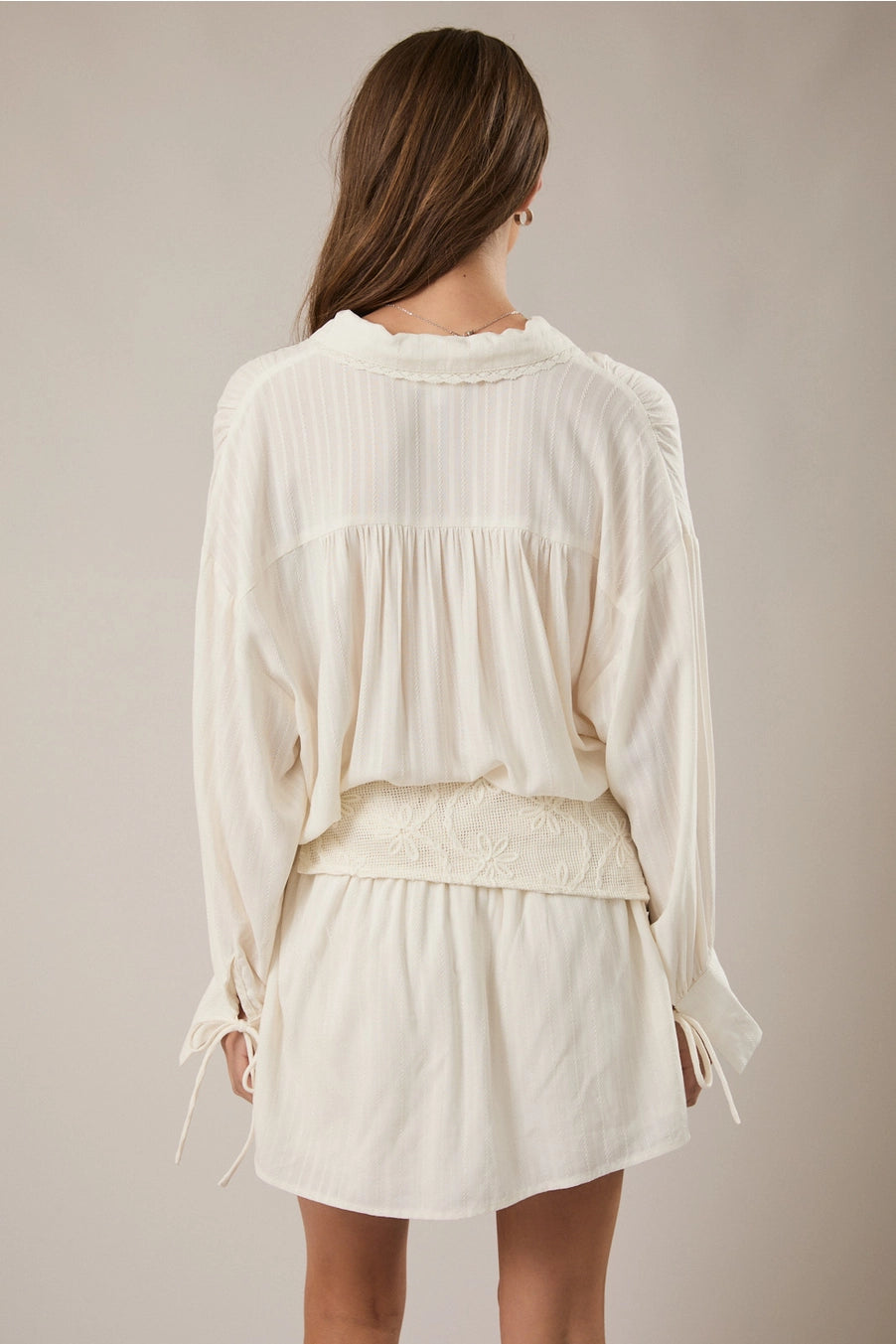 Soft, feminine, and effortlessly refined. The Lace-Waist Tie-Neck Mini Dress features a lightweight, textured fabric with a delicate tie neckline and subtle button detailing. Billowy long sleeves and a relaxed silhouette are balanced by a wide lace waist panel that defines the shape without feeling restrictive.