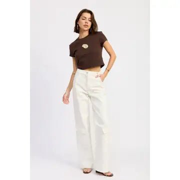 Minimal—with a twist. This cropped short-sleeve tee is designed to elevate your everyday basics with a sleek silhouette and a refined statement detail. Crafted from a soft, comfortable fabric, it features a classic crew neckline and a flattering cropped length that pairs perfectly with high-rise denim or tailored bottoms.