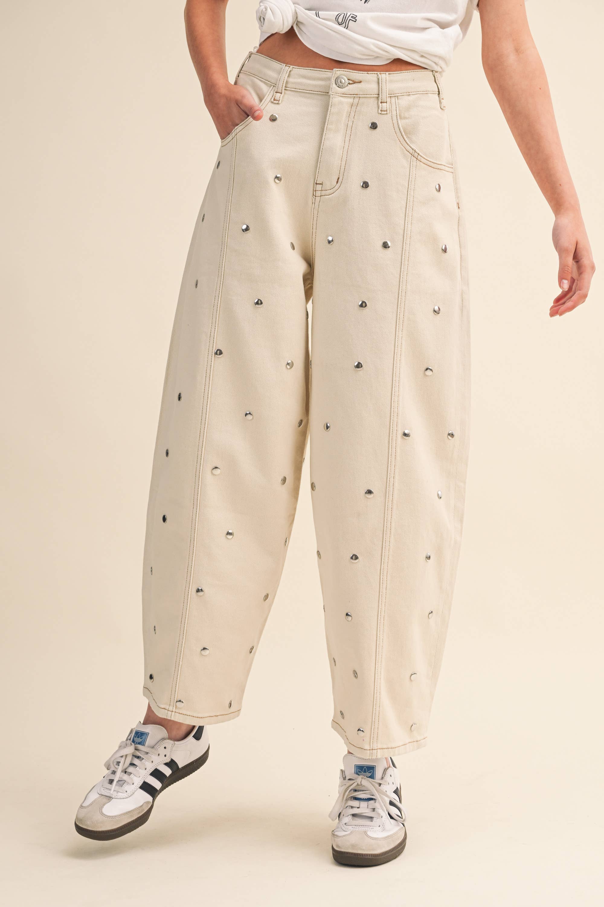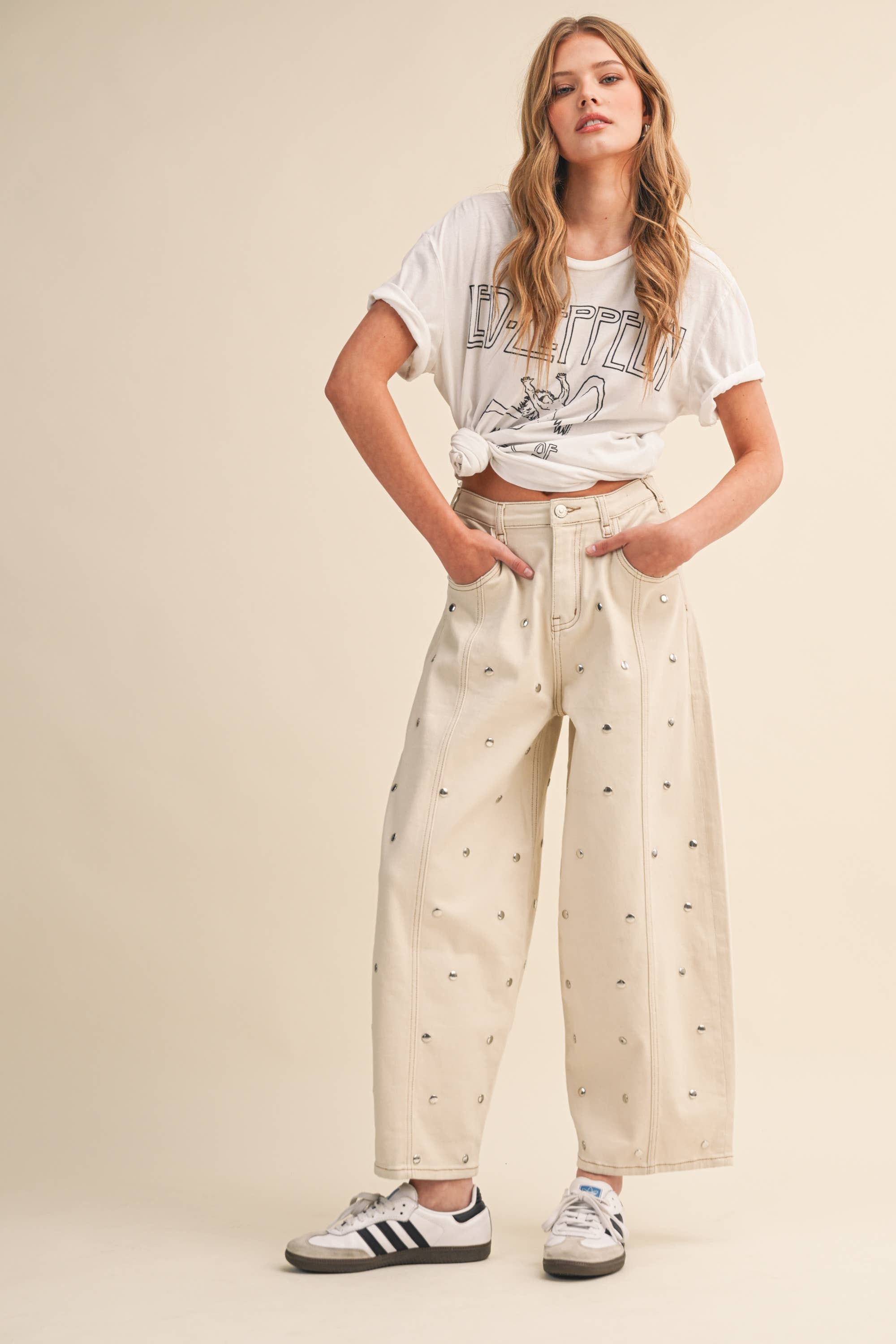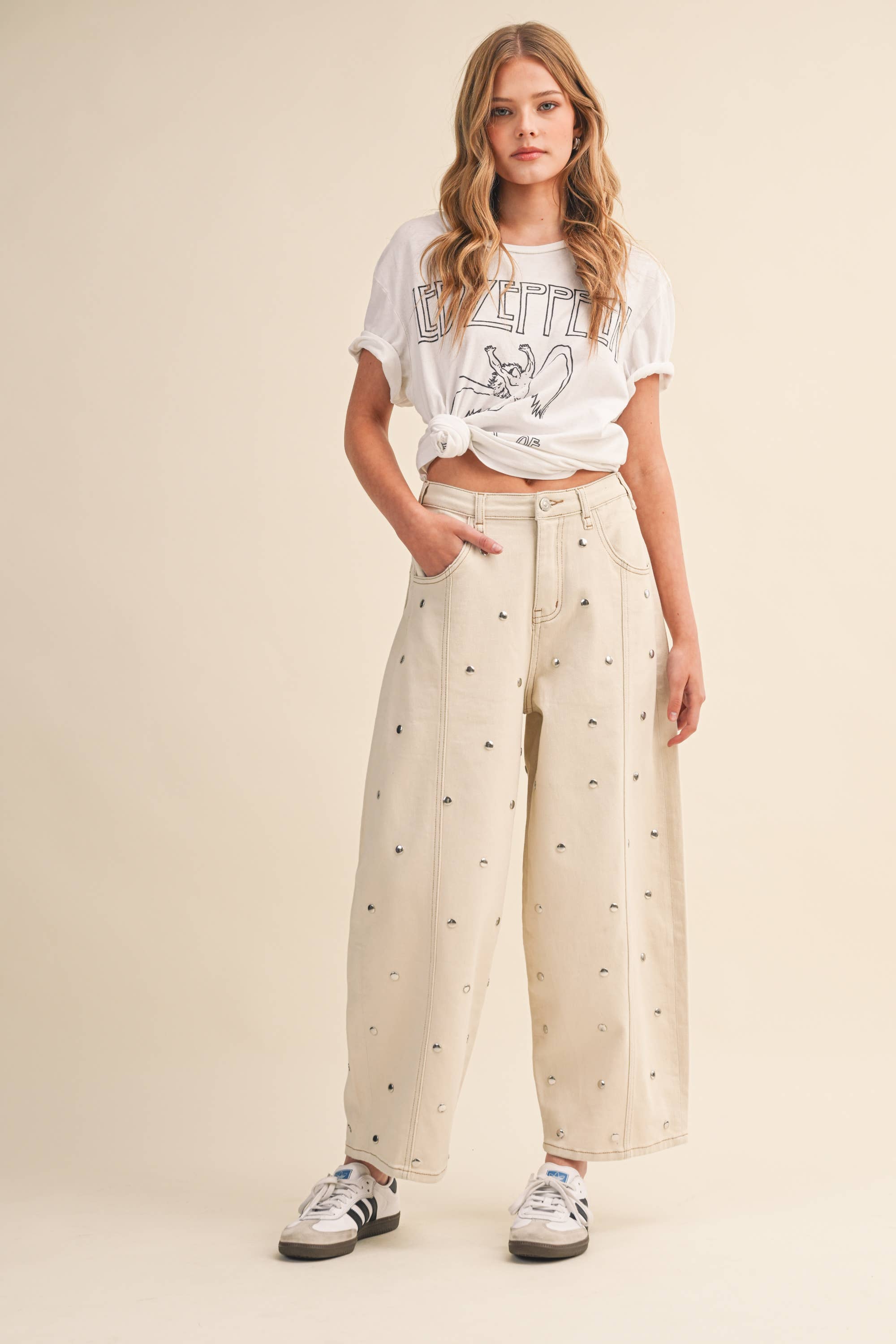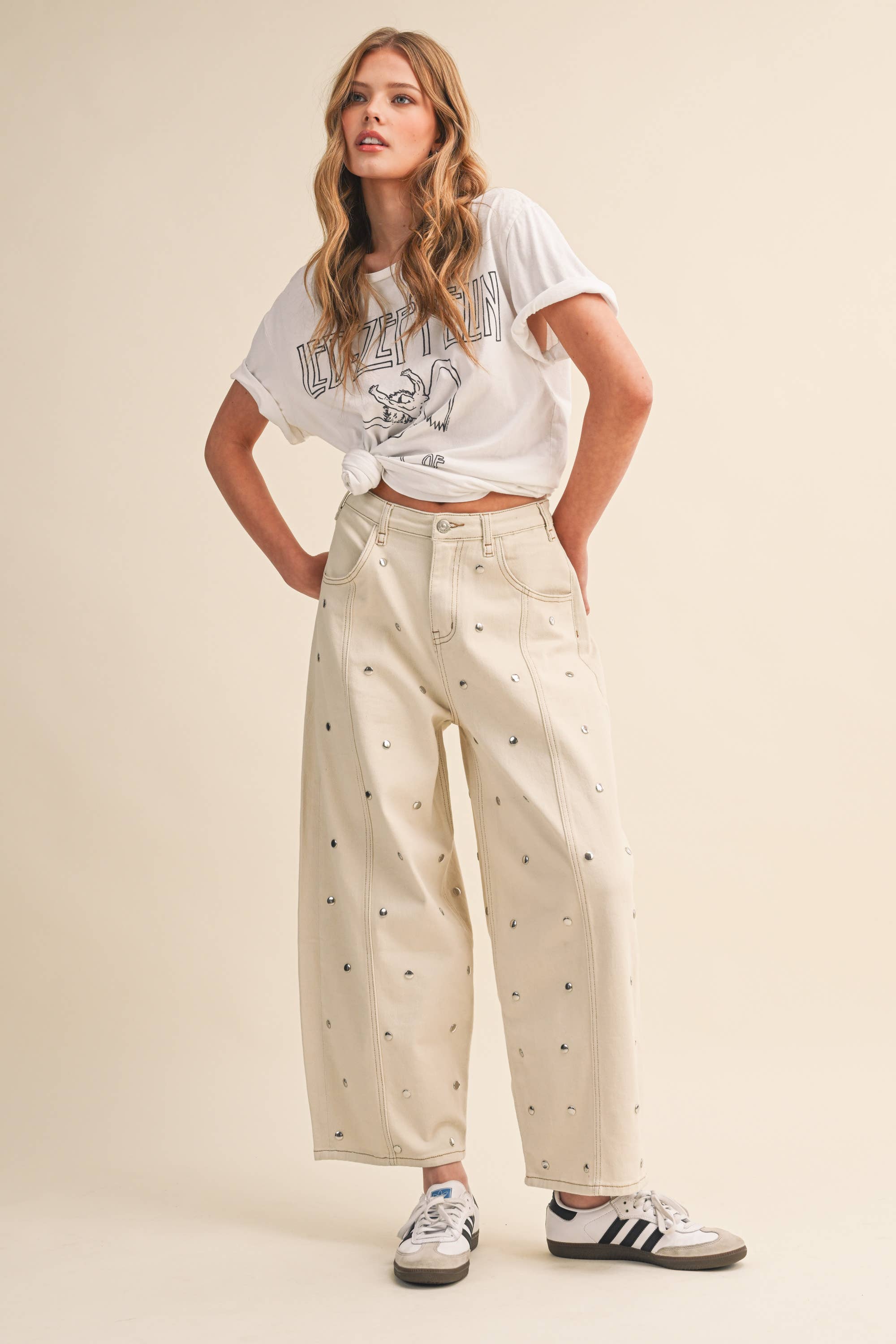 These cwide-leg jeans are designed to stand out. Featuring a relaxed, high-rise fit and subtle all-over stud detailing, they give effortless cool-girl energy with just the right amount of shine. The structured denim keeps its shape while the roomy leg creates that flattering, elongated silhouette everyone’s obsessed with right now.